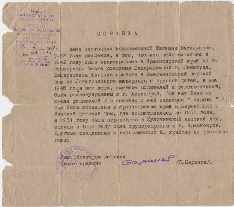 Im Mai wurden alle Kinder, die Eltern oder Verwandte besaßen nach Leningrad zurückgeschickt. Da Schenja keine Eltern hatte und in den Listen als „Waisenkind“ ausgewiesen war, blieb sie in der Region Krasnojarsk und kam in ein Kansker Kinderheim, wo sie bis 1951 erzogen wurde; 1951 brachte man sie dann ins Kulitschinsker Kinderheim, von wo aus sie 1954 einen Arbeitsplatz in der Stadt Krasnojarsk vermittelt bekam.