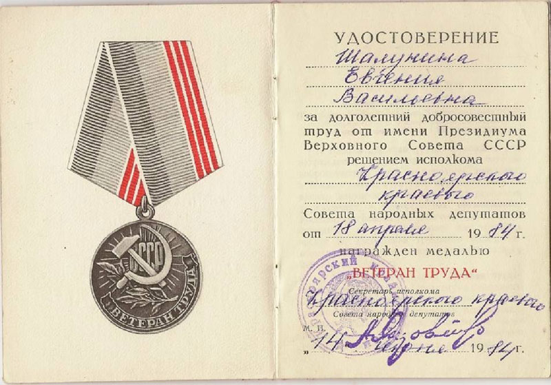 Am 18. April 1984 wurde sie mit der Medaille „Veteran der Arbeit“ ausgezeichnet (Anhang 9).