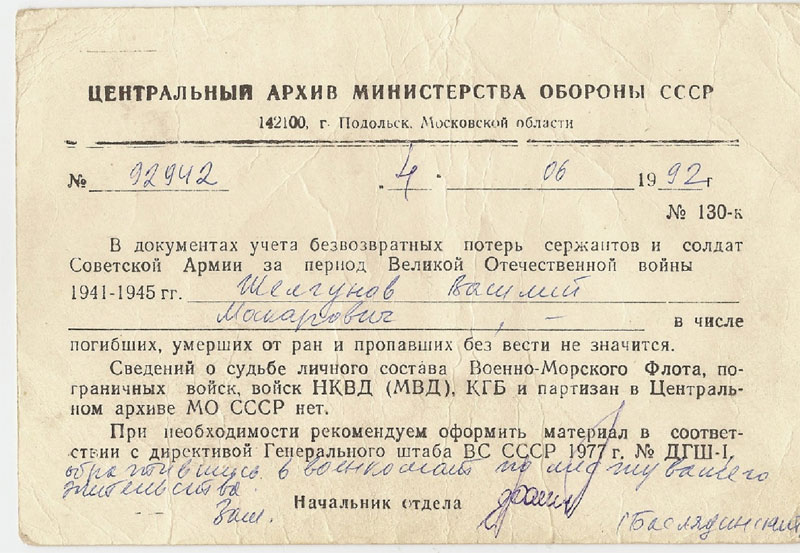 Im Verlauf der Arbeit sah ich mich noch vor eine weitere Aufgabe gestellt – die Suche nach Jewgenia Wasiljewnas Verwandten. Als Jewgenia Wasiljewnas Mutter starb, war sie erst vier Jahre alt, und sie kann sich an sie fast überhaupt nicht mehr erinnern. Jewgenia Wasiljewna dachte immer, dass ihre Mutter zwischen 1915 und 1917 geboren und ganz jungen verstorben sei. Jewgenia Wasiljewna war auch sehr am Schicksal ihres Vaters Wasilij Makarowitsch Schelgunow interessiert. In ihrem Leben schrieb sie zahlreiche Briefe an verschiedene Organisationen mit der Bitte, ihr bei der Suche nach Informationen über ihren Vater behilflich zu sein. Aber auf all ihre Anfragen kamen nur negative Antworten (Anhang 11).