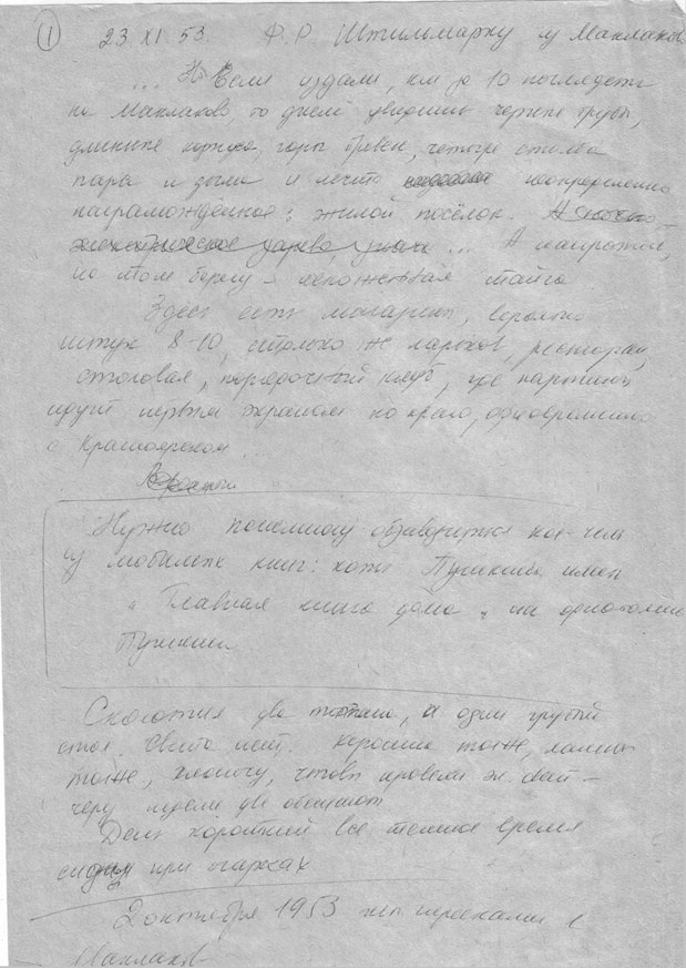 Die ernsthafteste Besorgnis – ist die Unsicherheit der beruflichen Situation. So sehr ich mich „am richtigen Platz“ während der Expedition befand (er arbeitete als Geodät beim Bau der Chaussee von Krasnojarsk nach Jenisseisk – F.S.) und dort „ganz bei der Sache“ war (wenn auch mit schlechter Bezahlung), so sehr ist die hiesige Lage ungewohnt. Meine Pflichten als solche sind sehr angenehm, aber unschön ist immer noch das Gefühl der Hilflosigkeit vor den Naturgewalten im Hinblick auf die 18 Spezial-Berufe beim Bau, die meine ganze Autorität fordern und, was das Wichtigste ist, meine begründeten Einschätzungen. SO stehen die Dinge. Und in 6 Monaten steht noch ein großes Ereignis bevor – die Geburt eines neuen Menschenkindes, des ersten sibirischen Stilmarks. Marita wartet ruhig und mit Freude darauf, ich dagegen bin in Sorge und Aufregung und – freue mich natürlich auch… [13]