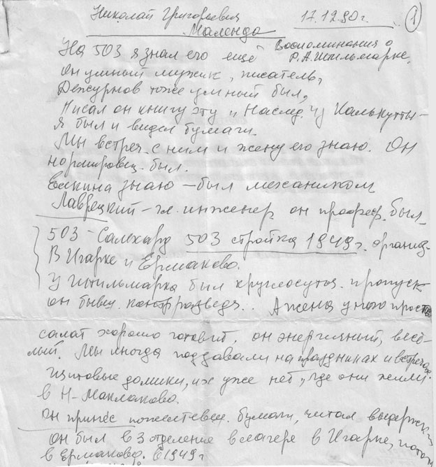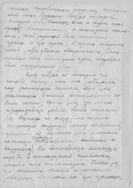 A. Stilmark: Ja, genau, aber im Lager… Schließlich hätten sie ihn im Lager eigentlich ermorden sollen. Na ja, erstens sage ich, dass die Intelligenten, selbst wenn sie keineswegs arbeitsscheu waren, bei allgemeinen Schwerstarbeiten nicht überlebten. Und, ungeachtet der Tatsache, dass der Vater, der den Krieg, fast die gesamte Leningrader Blockade durchgemacht und niemals untätig herumgesessen hatte, bei einer derart schweren körperlichen Arbeit wohl kaum überlebt hätte. Im Allgemeinen überlebten auch nur wenige; am ehesten kamen Männer, Arbeiter, die eine bäuerliche Vergangenheit hatten, durch. Aber Menschen aus den Kreisen der Intelligenten, adelige Söhne und Töchter, schafften es zumeist nicht [4,46].