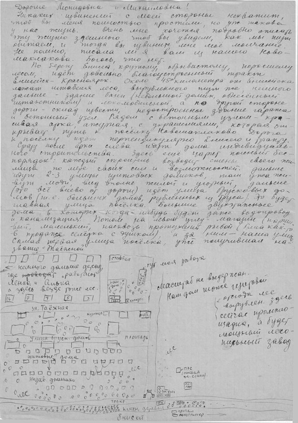 Wie ich das bewerkstelligen soll, weiß Gott allein, aber ich habe dasselbe Gefühl, wie seinerzeit in der Schule, wenn du weißt, dass morgen eine Arbeit in Algebra geschrieben wird, und du dir durch keinerlei Gebete die Kenntnisse über all das erflehen kannst, von denen du armer Sünder auch nicht annähernd eine Ahnung hast; doch der morgige Tag wird unwiderruflich diese Testarbeit mit sich bringen. Nachdem ich fünf Tage in Ljonjas (der Name meines Kameraden, der uns Unterschlupf gewährt hat) Wohnung gesessen hatte, erreichte ich, dass man in einem der noch nicht fertig gestellten Holzbauten mit vier Wohnungen einen Ofen setzte und die größten Ritzen und Löcher abdichtete. Das wurde widerwillig erledigt, und dann, am 2. Oktober, einem Sonntagabend, setze ich mich auf Ljonkas Stühlchen vor Ljonkas Tischchen (das gerade einmal die gleiche Höhe wie meine Knie hat) - in meinem eigenen „Haus“, d.h. in der aus zwei Zimmerchen bestehenden Wohnung, mit einer Gesamt-Wohnfläche von 21 qm, Herd, Kammer und sogar einer Öffnung im Fußboden für den zukünftigen Vorratskeller. Möbel haben wir nicht, aber ich habe schon einen Tisch aus Holzbrettern zusammengebaut. Derweil schlafen wir noch auf dem Fußboden, bald werden wir eine hölzerne Bettstelle besitzen. Nur Lenka hat eigene Möbel – ein Bett, ein Tischchen und ein Stühlchen. Für uns selber, drei Erwachsene, haben wir einen Hocker und eine Sitzbank. Auch ein paar Regale sind schon fertig; so richten wir uns nach und nach ein. Zu unserem Leidwesen ist Lenka krank geworden: die arme Kleine hat 40 Fieber; es sind die Masern, die sie aus Jenisseisk mitgebracht hat. Das Kindchen weint, die Mutter schläft nächtelang nicht. Und ich bin so wahnsinnig mit der Arbeit beschäftigt, dass ich systematisch bei Tagesanbruch das Haus verlasse und erst im Dunkeln wieder heim komme; ich habe keine Zeit für die häuslichen Dinge. Unsere Unterkunft weist mit den Fenstern zur Straße. Sie ist noch nicht verputzt und nicht geweißt, also noch ganz „roh“, d.h. alles riecht nach harzigem Holz. Die Fenster sind ganz gewöhnlich verglast – für den Sommer. Einstweilen ist es draußen noch warm, in der Wohnung herrschen 23 Grad, aber wenn es 50 Grad Frost gibt … wir haben keine Ahnung, was dann mit dem unbeheizten Holzhäuschen passiert!