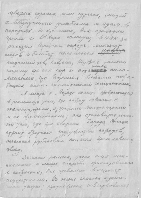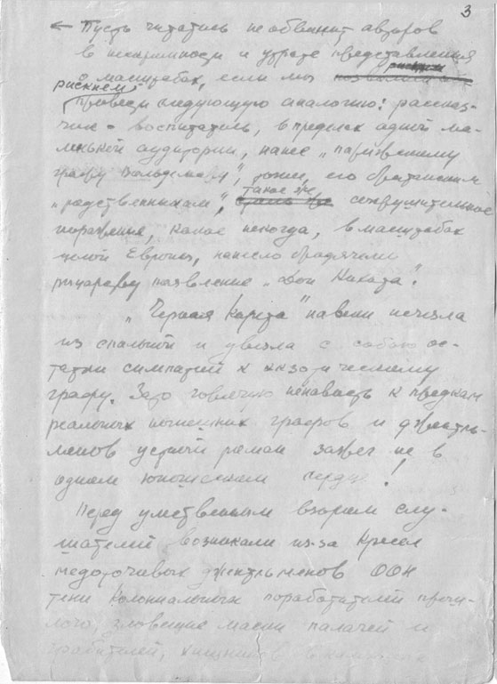 Sie beschlossen, dass er schreiben, Kultur machen sollte; wir werden sie aufnehmen – und alles wird gut. So also blieb der Vater am Leben. Später sagten sie Wassiljewskij: was machst du denn, du Dummkopf? Nachher rufen die dich zu sich, und du kannst noch nicht mal richtig Russisch; man sieht doch, wie dumm du bist! Wenngleich er kein Dummkopf war, gehörte er doch zu den durch und durch Ungebildeten. Er war sogar ziemlich klug, dieser Bandit. Weil er nämlich später derartige Betrügereien beging, und man kann wohl sagen, dass er ein Mann von heute war, dass Russland mit seiner Gestalt eine einzigartige Person verlor!