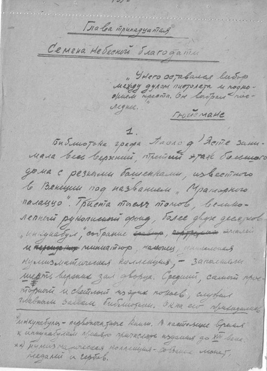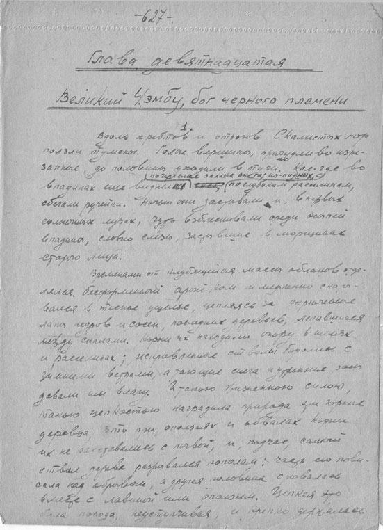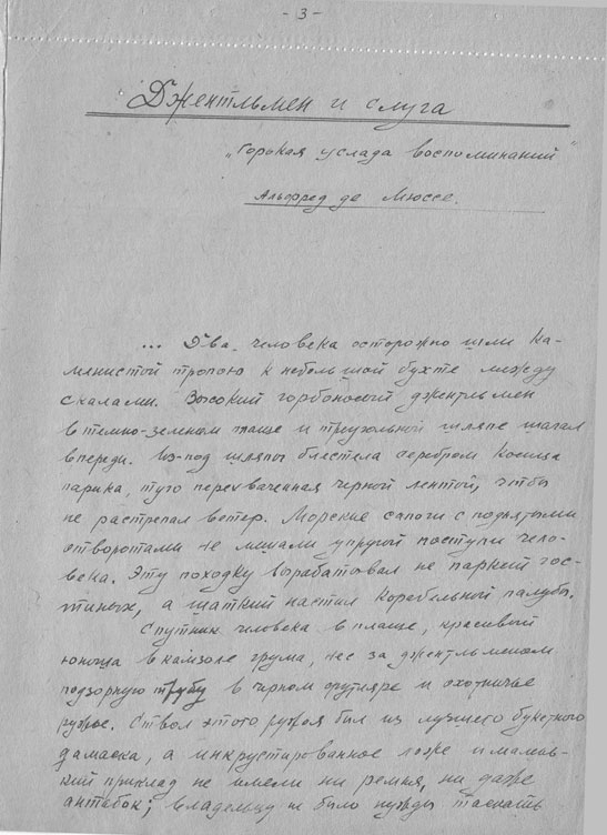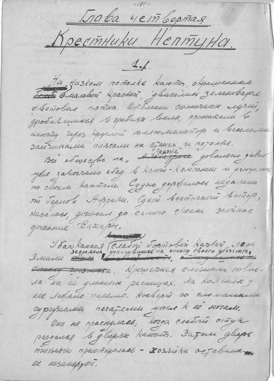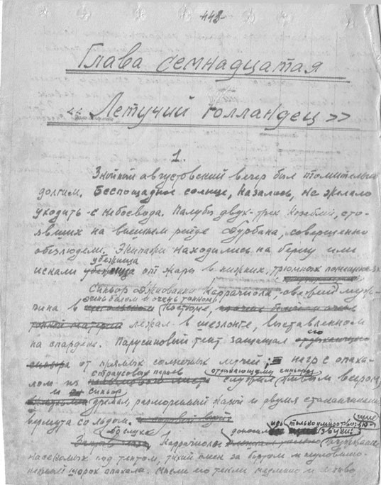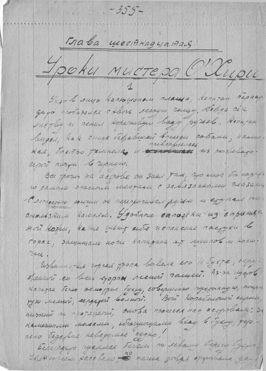 Nachdem er seine drei Öllämpchen eingestellt hatte, „eine war ohne Glas (genannt „Beleuchtungssystem auf Einladung der Vorfahren“), nahm er Briefpapierblätter und … die verrußten Wände der erbärmlichen Hütte verschwanden, verwandelten sich in dunkelblaue Wellen des Ozeans, das Schiffsdeck der Brigg „Orion“, Seeschlachten, Bälle bei Hofe und Bison-Jagden, und so entstand sein dreibändiges Werk, das den Titel „Der Erbe aus Kalkutta“ erhielt.