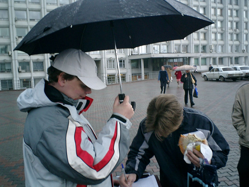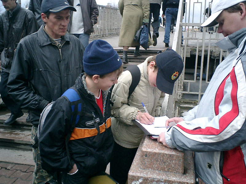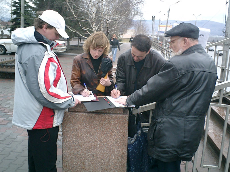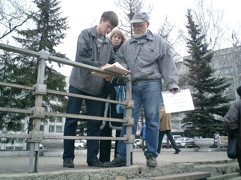 Den ganzen Tag lief neben dem Bürgermeisteramt eine Unterschriftensammlung. An ihr nahmen Aktivisten der krasnojarsker Gesellschaft „Memorial“ sowie der krasnojarsker Vereinigung von Opfern rechtswidriger politischer Repressionen teil.