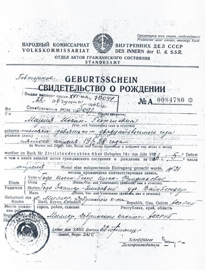 Starting with the year 1764 the Volga region has been the home region of our family, and only for my parents, my brothers and sisters and me the birthplace and home became Siberia. My mother was born in the Sukhobusimo district, where she grew up; after having finished the school in Bolsheprudovo, she received a special training to be a teacher for the lower grades at the Gorki Teacher's Training College in Krasnoyarsk. Now mum has already been working for the Istosk school for more than 17 years; she teaches the little ones how to write, count, read; and she also teaches them to see the beautiful and to love nature. And this is what she also imparted to me, my mum - my first teacher.