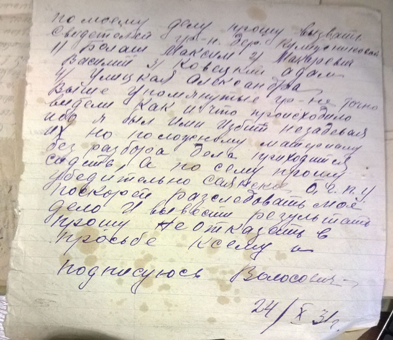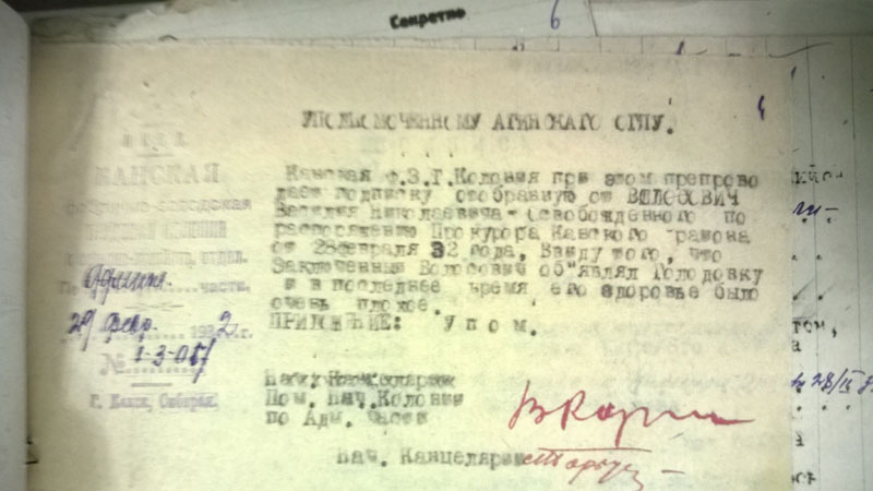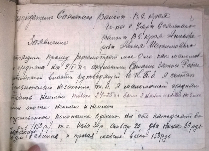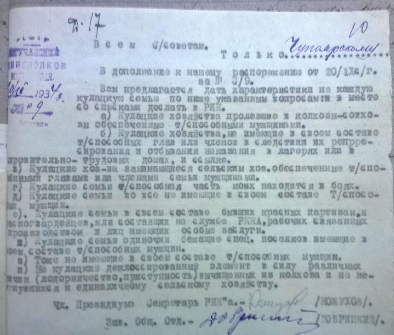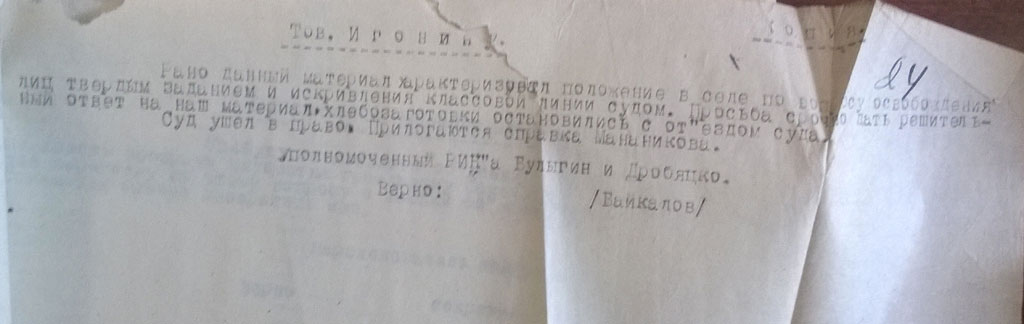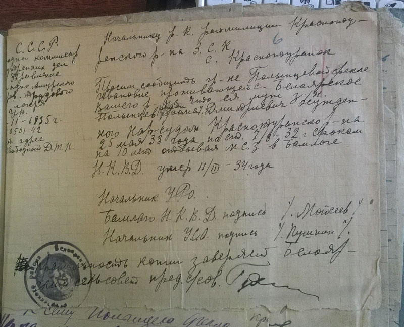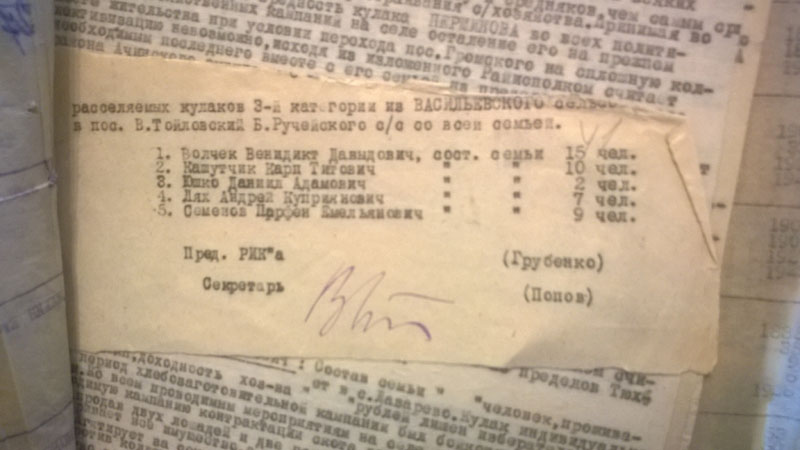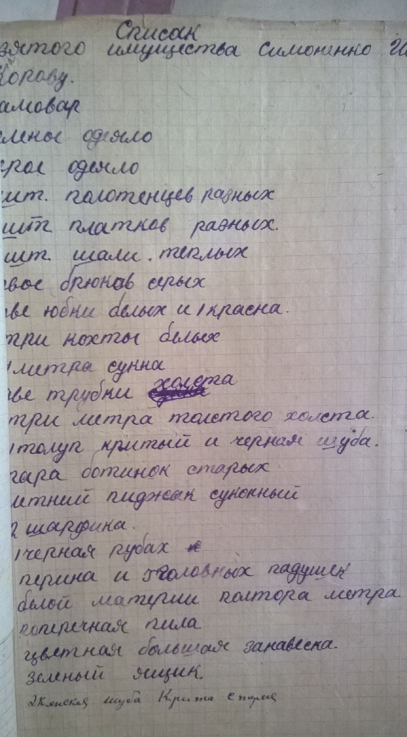 И, напоследок - цитата: "Будучи председателем колхоза в 1931 году крадучи от членов колхоза таскал товар из закрытого распределителя который оказался зашитый в перине". (ГАКК. ф. Р-1748 оп. 1. ед.хр.228, л.4)