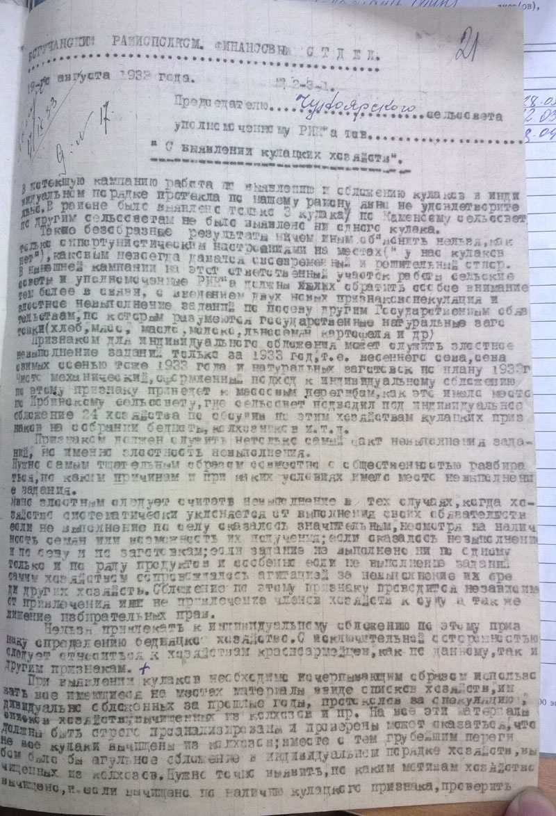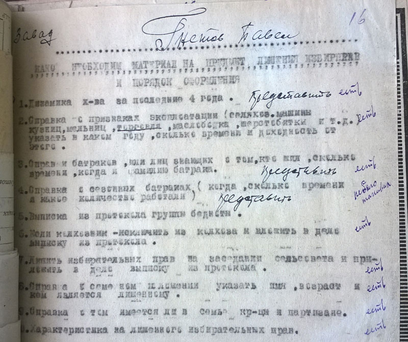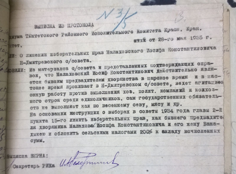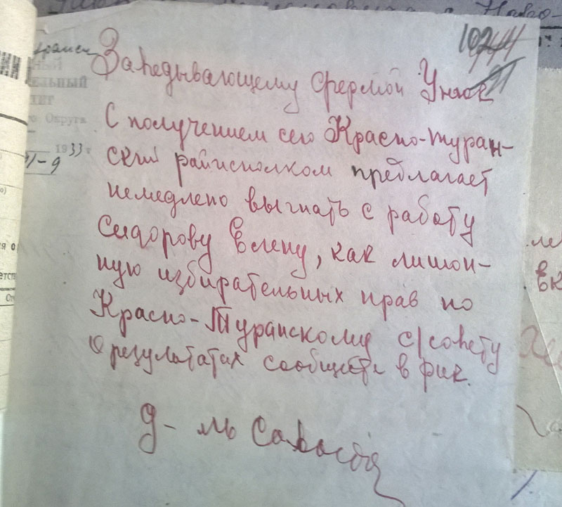 И вот ещё, по Чуноярскому сельсовету было. Район запрашивает: сообщите причины лишения прав таких-то и таких-то. Сельсовет отвечает: все перечисленные прав не лишены, они проходят как середняки.. Что уж там сельсовет получил в устной форме, но - года не прошло, у всех перечисленных в делах вижу решения сельсовета: обложить индивидуальным налогом: