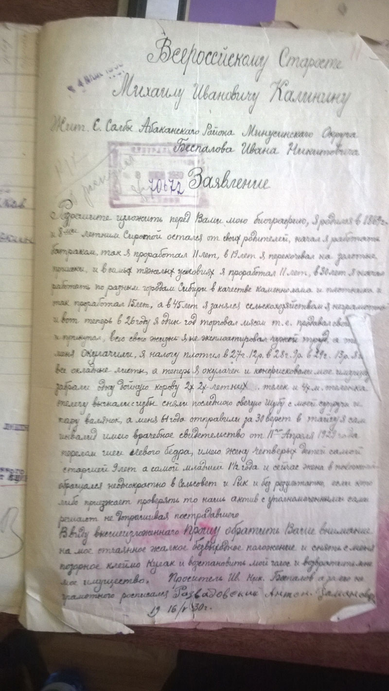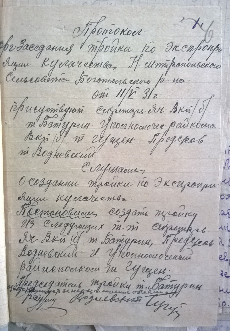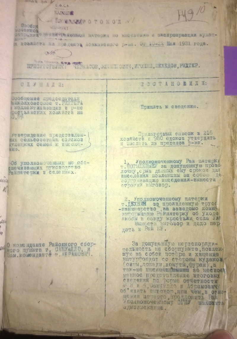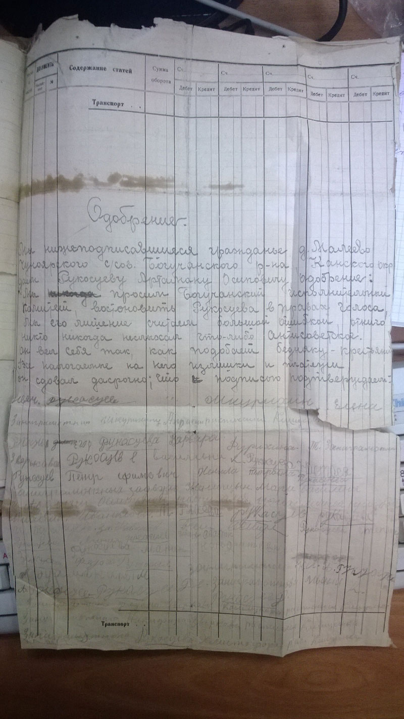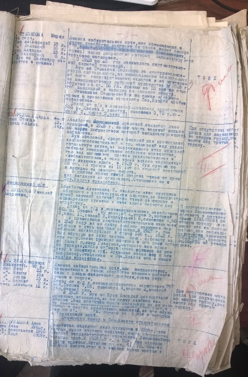 Да, кстати. Поскольку районный архив сгорел, пришлось читать сельсоветские протоколы. Они неприятны сами по себе - детально описано, как люди топят друг друга. Они нечитаемы, поскольку написаны простым карандашом на серой бумаге. В Богучанском районе к тому же типичный протокол выглядит так:
