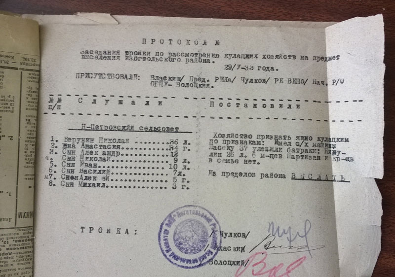 Точнее, пропала централизованная информация - в сельсоветах дела остались (кроме тех, которые 19 мая 1931 года были на рассмотрении в райисполкоме и сгорели вместе с ним), но из этих дел не всегда ясно, что с хозяйством произошло (выселили, не выселили, и т.п.). Прошёлся по нашему мартирологу, вытащил Брюхановых с Рукосуевыми, сверил список богучанских "кулаков" по мартирологу и по делам фонда Р-1748. Ой-ой-ой... И это только те, кого мы уже знаем - их уже больше, чем в списке. А сколько не знаем...