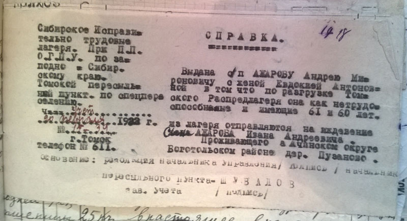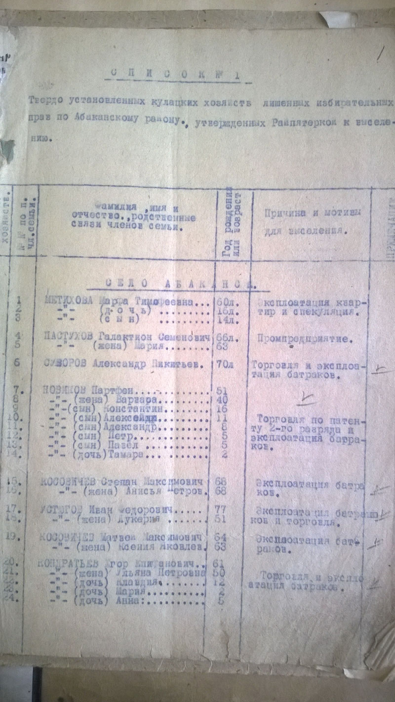 С Ачинском интересная подробность. Это был своего рода промежуточный пункт. Среди ачинских лишенцев довольно много лишенных с формулировкой "кулак из такого-то района" или даже "высланный кулак из другого района". Скорее всего, это "третья категория", потому что жили они не в спецпосёлках. Семью лишили имущества и возможности заниматься сельским хозяйством, она вынуждена перебираться в город, где можно устроиться на работу, найти какое-то съёмное жильё. Там их, конечно, ставили на учёт как лишенцев. Так вот в 1931 году, когда Ачинску надо было выполнять план по выселению, этих лишенцев оформляли уже по полной программе и высылали в спецпосёлки либо в Хакасии (Саралинские рудники), либо на территорию будущих Томской и Кемеровской областей. Потому что у многих мы уже знаем дальнейшую "траекторию", и она именно такая.