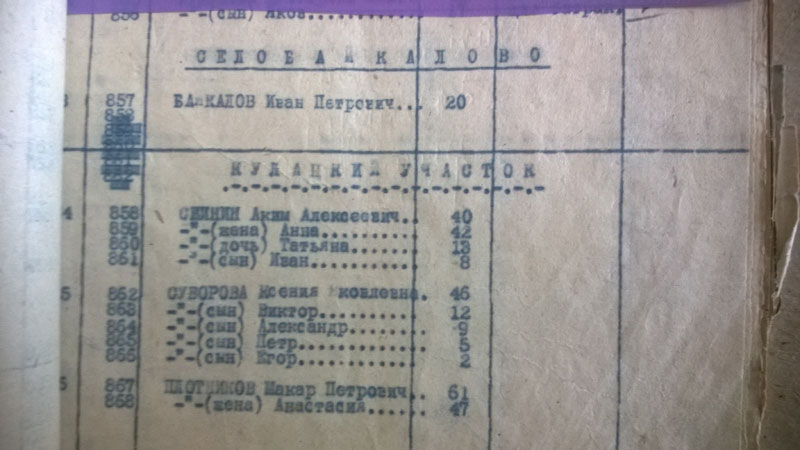 Рукосуевых в списке, к слову, с сотню семей. Людей раз в три больше. Кроме Быковых, Смолиных и Колпаковых, стали появляться в больших количествах Брюхановы, Лыхины и Скурихины. Других фамилий практически нет. Много тёзок, даже внутри одного сельсовета - различаешь только по составу семьи. Весело.