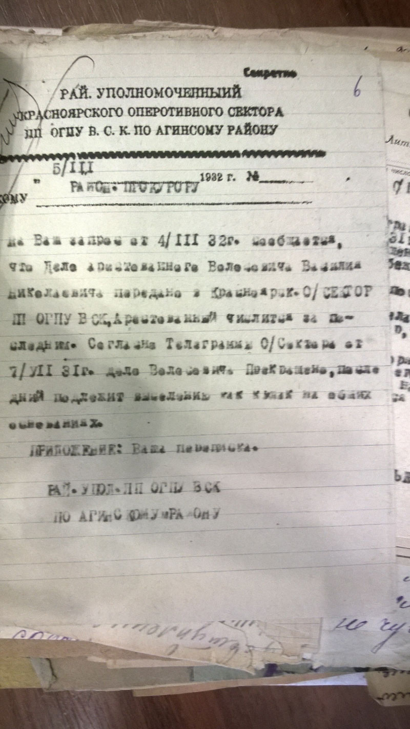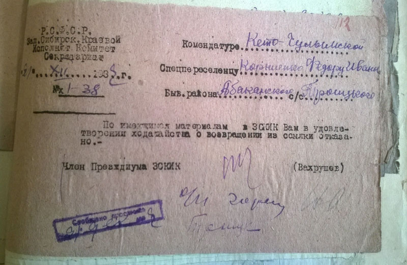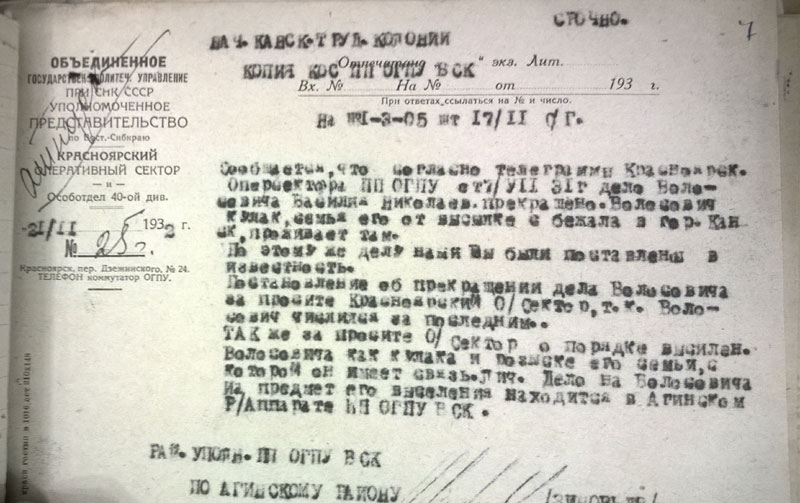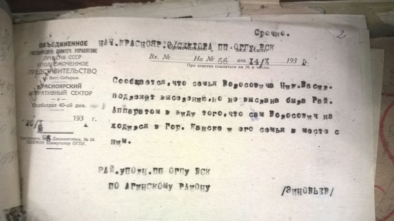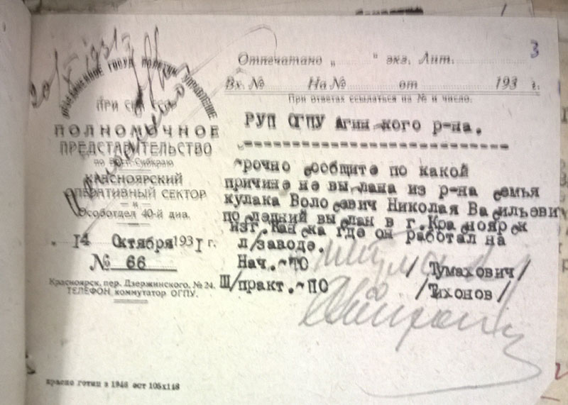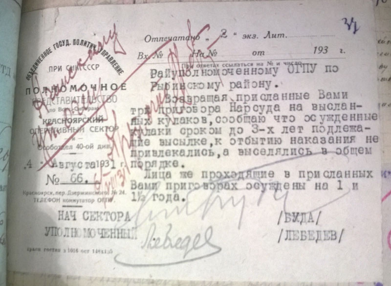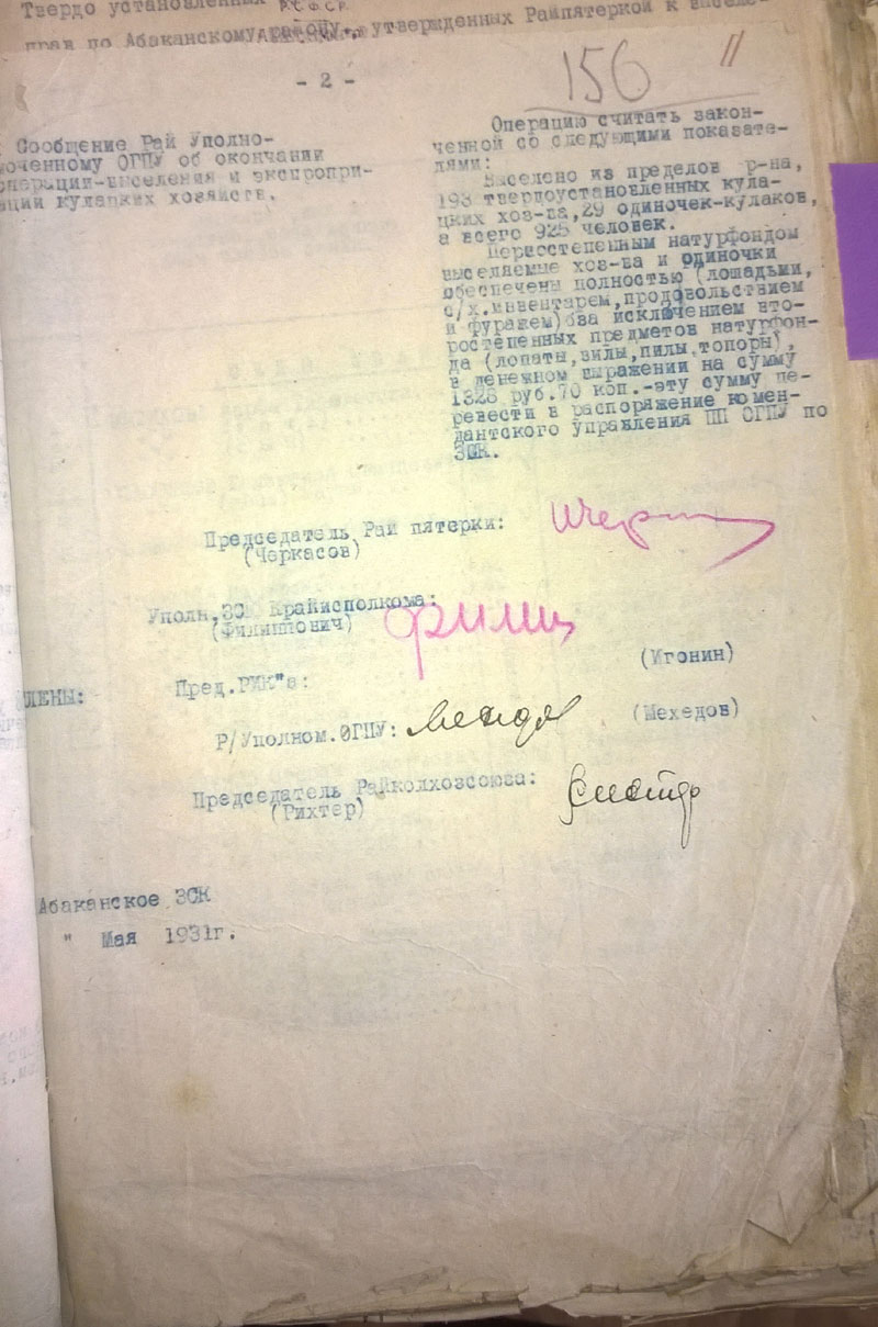Сегодня стало понятно, почему районных списков по Богучанскому району не будет. Никаких. Никогда. Ни лишенцев, ни на выселение. Оказывается, 19 мая 1931 г. Богучанский райисполком сгорел нафиг вместе со всеми документами. (ГАКК. ф. Р-1748 оп. 1. ед.хр.178). А значит, информация о самых массовых выселениях и экспроприациях - 1930 и 1931 годов, пропала навсегда.