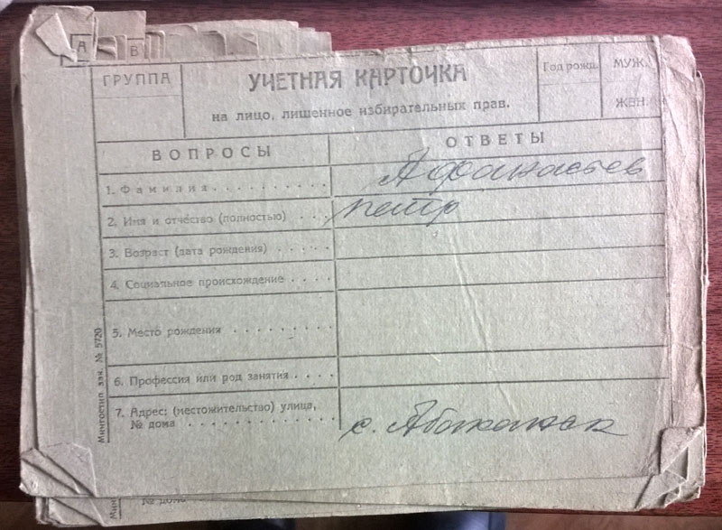 Дело Колпаковой Мавры Васильевны, которая ни к какому Колпакову не подходит. Где-то в деле попадается бумажка, что она была лишена прав как Рукосуева Мавра Васильевна, вместе с отцом Василием Матвеевичем. Василия Матвеевича в списках нет, но есть его сын Иван Васильевич, брат Мавры Васильевны. Чтобы это выяснить, пришлось сначала просмотреть Василиев Рукосуевых, потом Васильевичей Рукосуевых. И - вуаля!