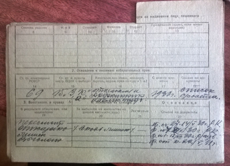 ХАСПЕКОВ (Хасбеков) Артемий Павлович. 56 л. Проживал в г. Ачинск. Состав семьи: жена Софья Касперовна 45 л., дочь 14 л. Лишен избирательных прав в 1930 как адмссыльный из Москвы на 3 года за продажу одного кротового пальто заграничного образца. (Архив г. Ачинска. Ф.310 оп. 1-С. дело 957, 833, 834)