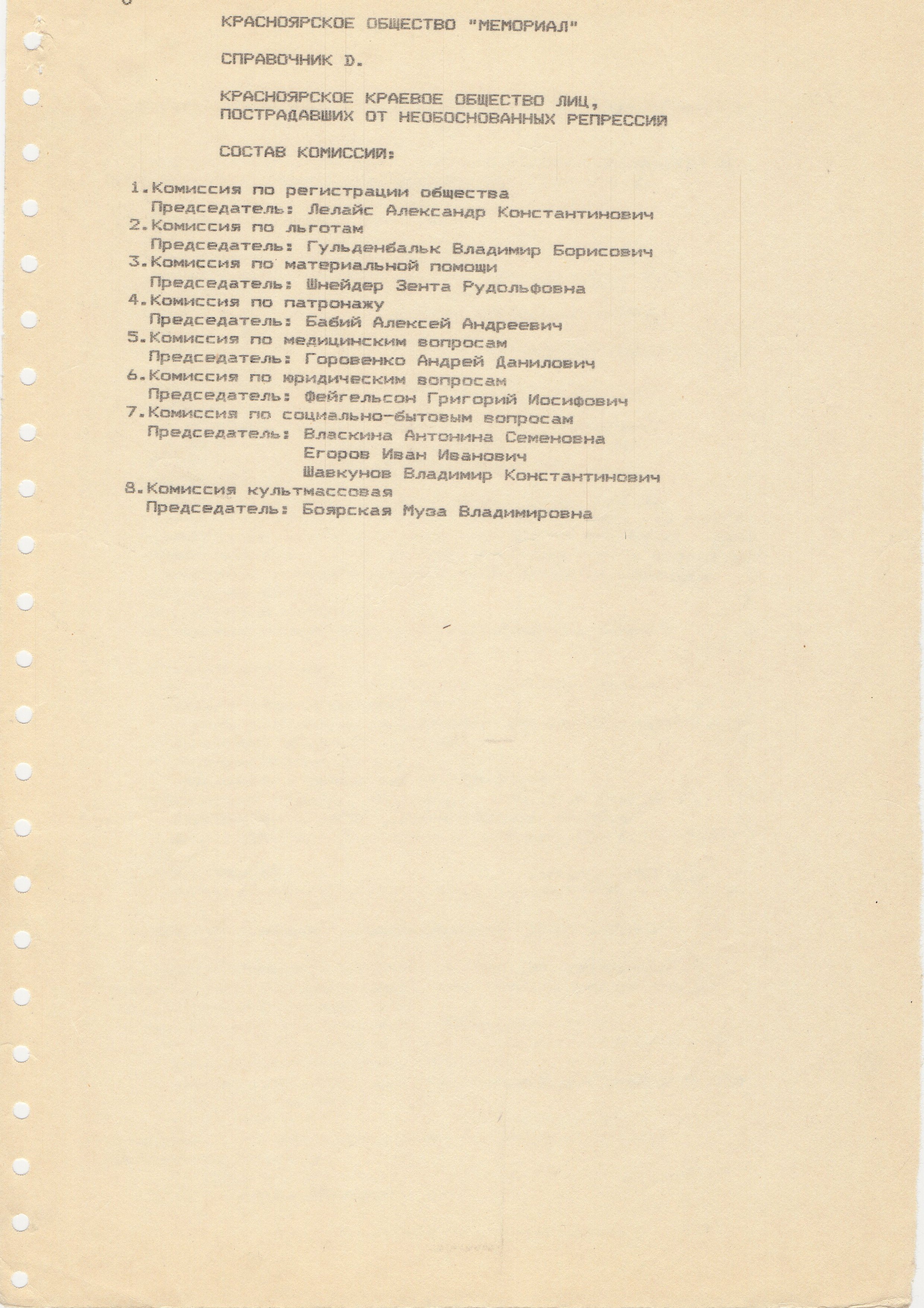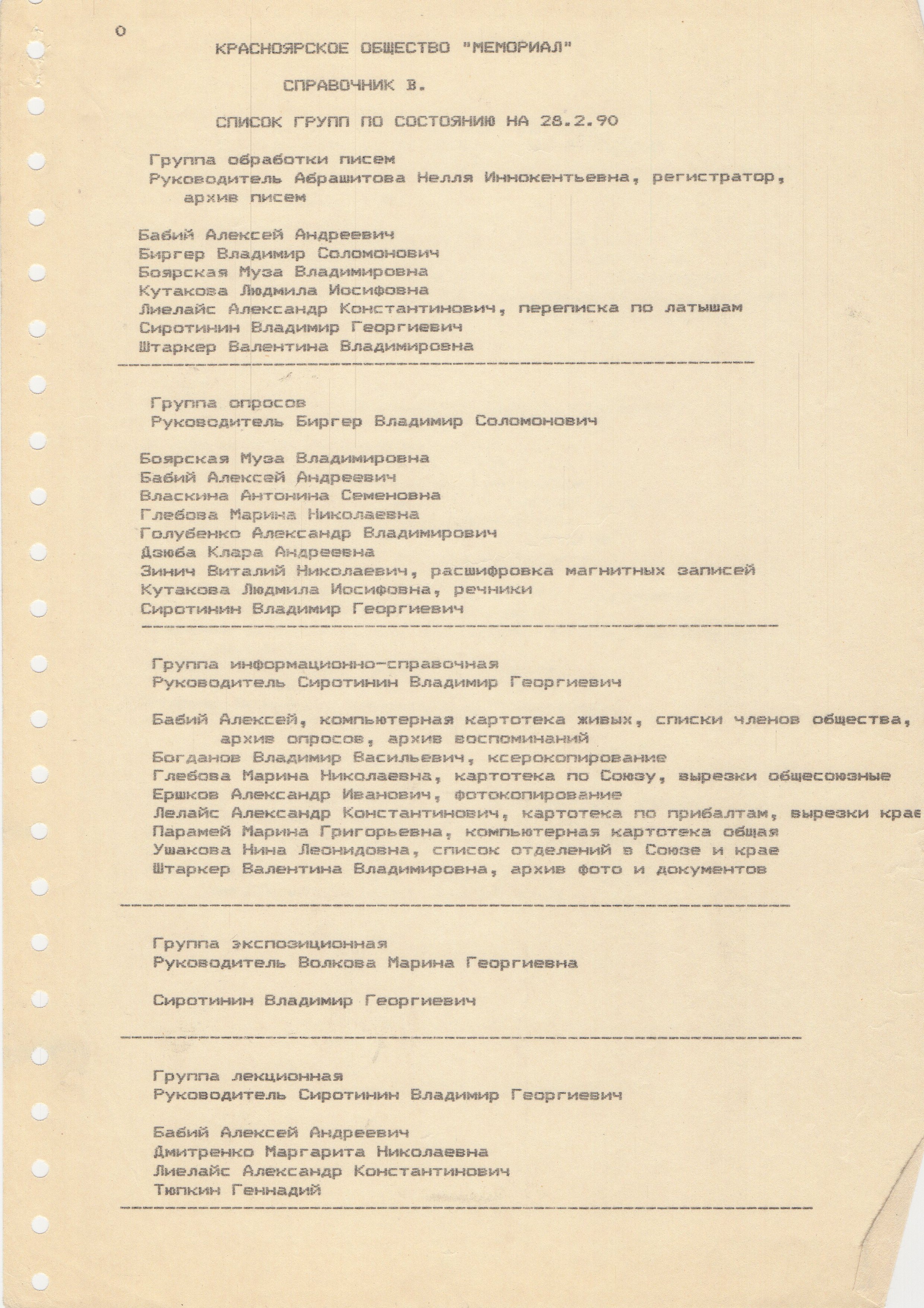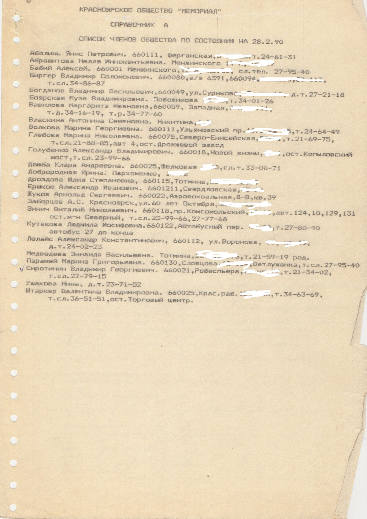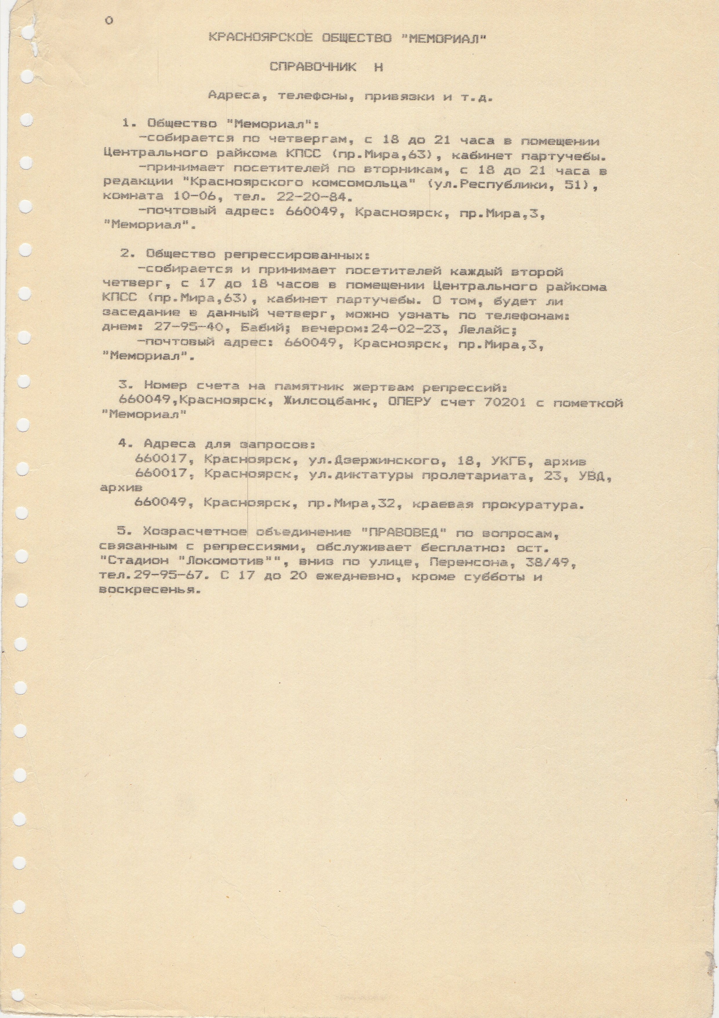 В справочнике H указано два места, где можно встретить "Мемориал". Приём посетителей - по вторникам в редакции газеты "Красноярский комсомолец". Главный редактор Людмила Батынская относилась к нам очень хорошо. Там нам вечером отдавали кабинет одного из журналистов, и мы там принимали посетителей. Кабинет мы украсили разными плакатами, привезёнными из Москвы.