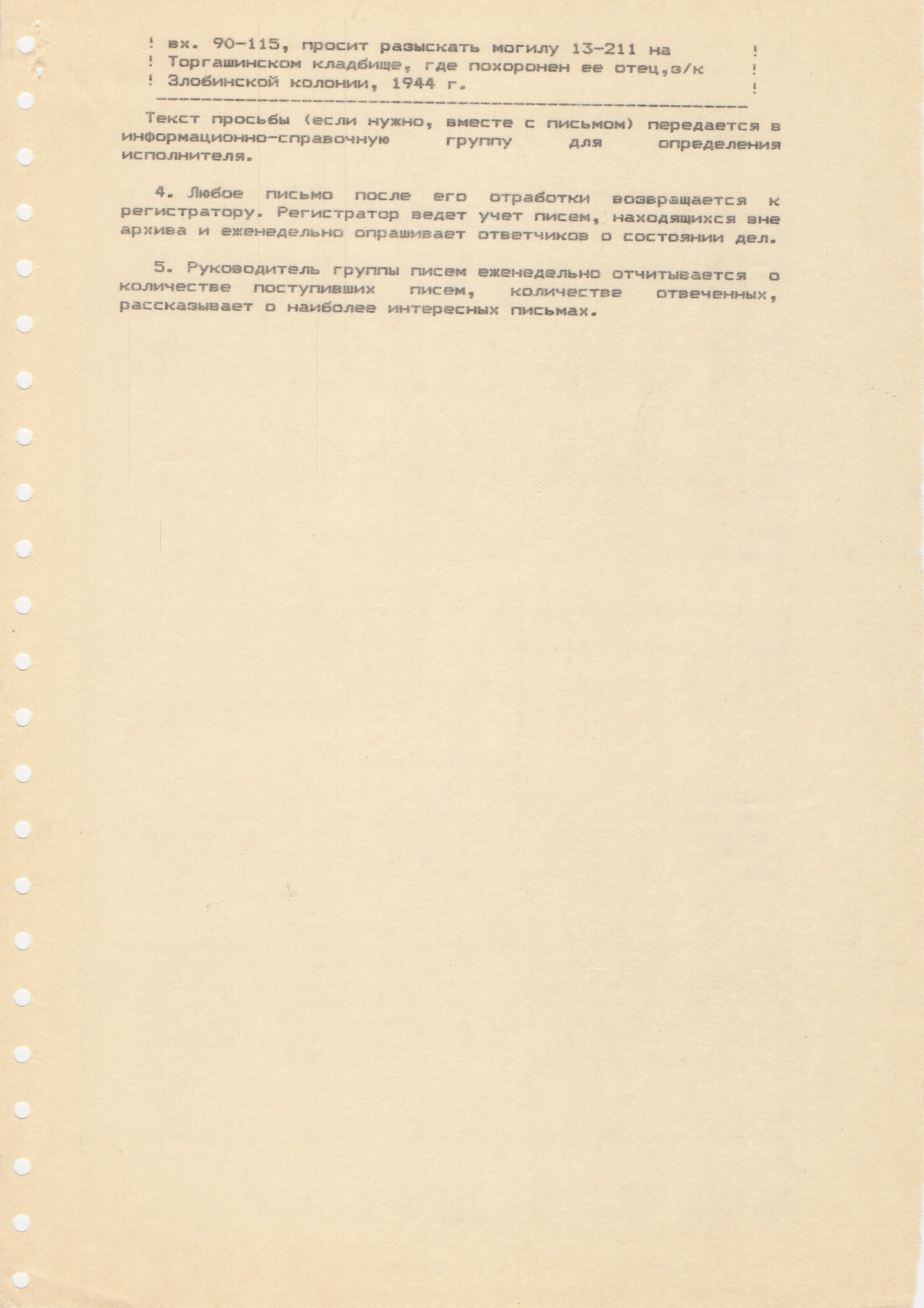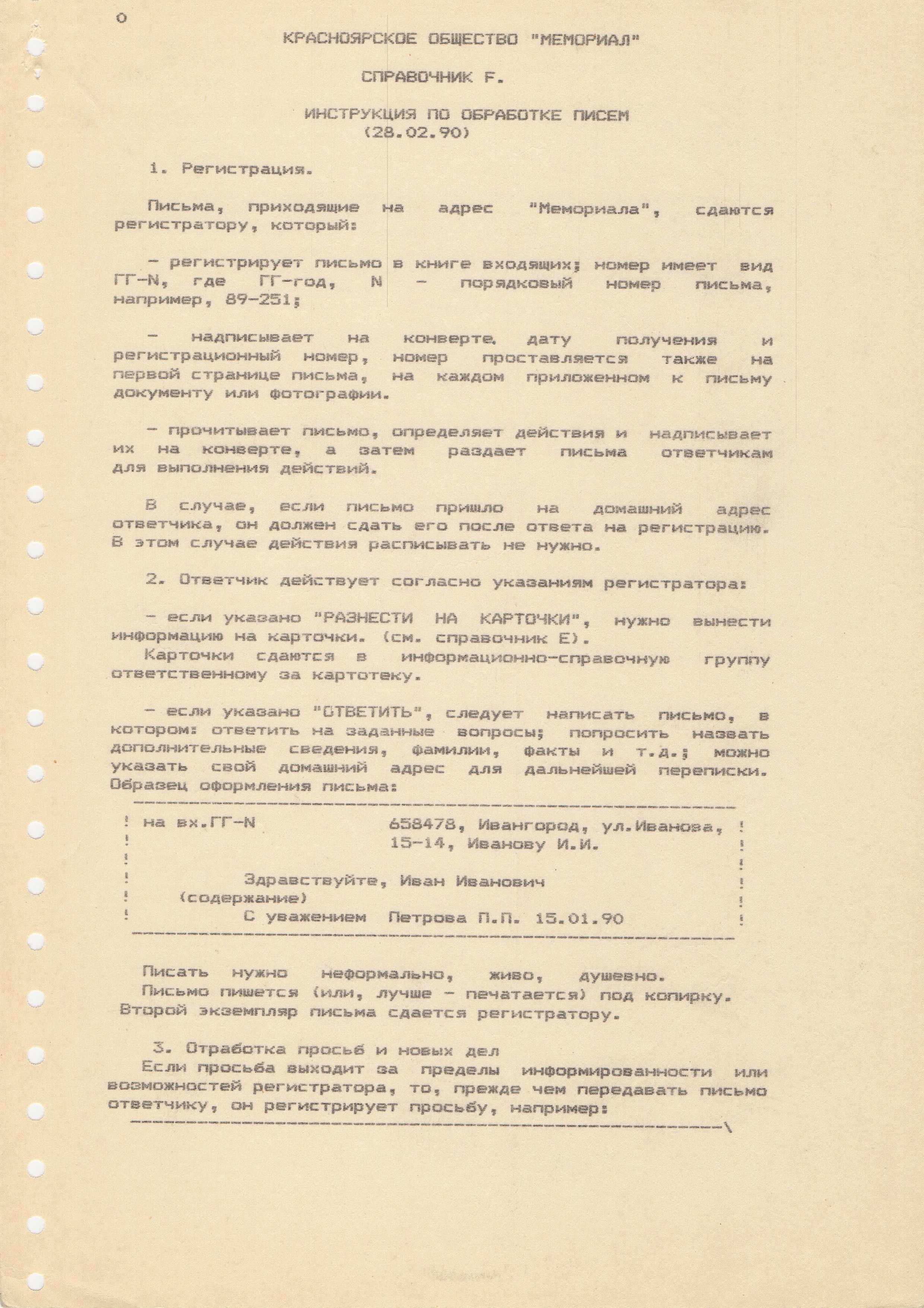 Вше приводился регламент обработки писем . Несколько лет у нас всё делалось "по уму" - велся реестр писем, было единое хранилище (хотя некоторые письма, ушедшие "на обработку", так и не вернулись), Потом, однако, всё это закончилось, письма хранились в разных местах, реестр не вёлся. В начале двухтысячных реестр возродился уже в Excel, но письма за предыдущие годы лежали в лучшем случае в пачках, перевязанных верёвочками, а то и просто затерялись где-то среди мемориальских бумаг.