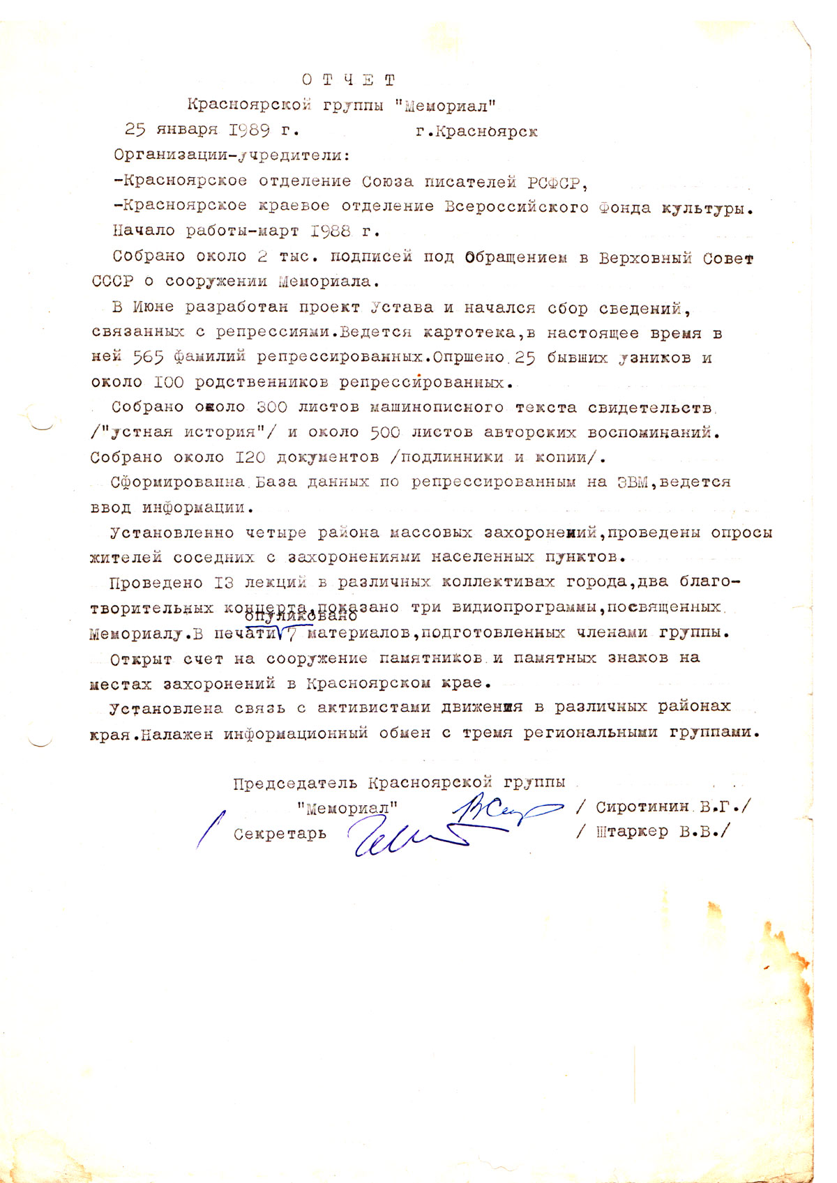 Чуть не забыл. Технология бумажного хранения. Ведь в те времена не было "файлов", файлодержателей, степлеров и прочих необходимых средств. Были дыроколы,скрепки, тонкие картонные скоросшиватели, картонные же папки и большие конверты, которые где-то тырили, в местах где они были не шибко нужны. Я, бывало. привозил из командировок убогие картонные же толстые советские "файлодержатели", которых в Красноярске почему-то не было. Использовали также большие конверты из-под фотобумаги. Ксероксами тогда тоже не пахло, иногда удавалось некоторые документы "отэрить", но чаще их просто фотографировали или даже переписывали от руки. Сильно потом, уже в 1993 году, "Мемориалу" стала перепадать нормальная канцелярия, поскольку я к тому времени работал в фирме "Красфайл", которая одной из первых, если не первой, стала эту нормальную канцелярию завозить в Красноярск. Обзавелись мы и ксероксом, подарил кто-то в Москве.