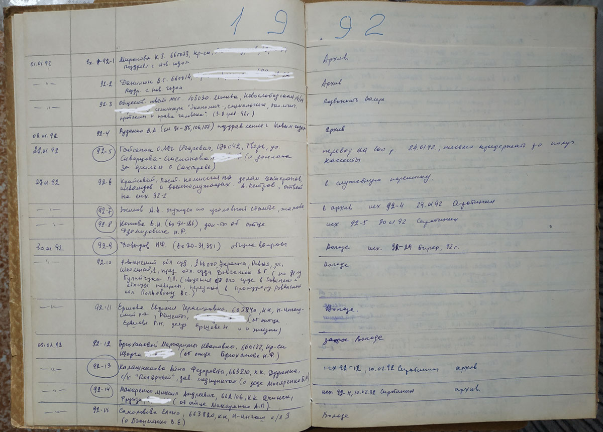 А вот это - реестр входящих 1992 года, когда его вёл Владимир Сиротинин.