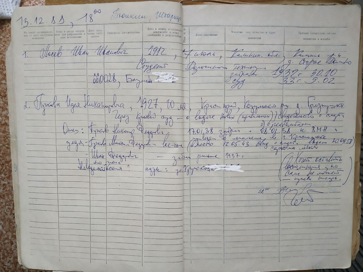 Журнал приёма ,13 декабря 1988 г. Дежурные Валентина Штаркер и Геннадий Тюпкин
