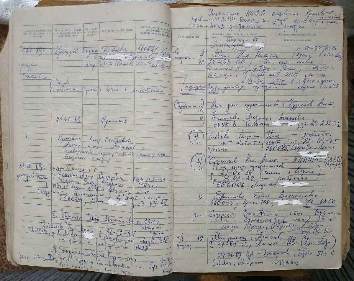 Люди шли в основном с тем, чтобы рассказать о своих репрессированных родственниках, и мы делали запросы в УВД и КГБ. Нередко приходили и сами репрессированные - многие тогда были ещё живы. Кто-то приходил с бытовыми проблемами, и мы пытались их решать. Дежурили в "Комсомольце" по очереди, но, бывало, приходили не только дежурные, но и другие мемориальцы, "на огонёк" и заодно помочь - народа приходило очень много.