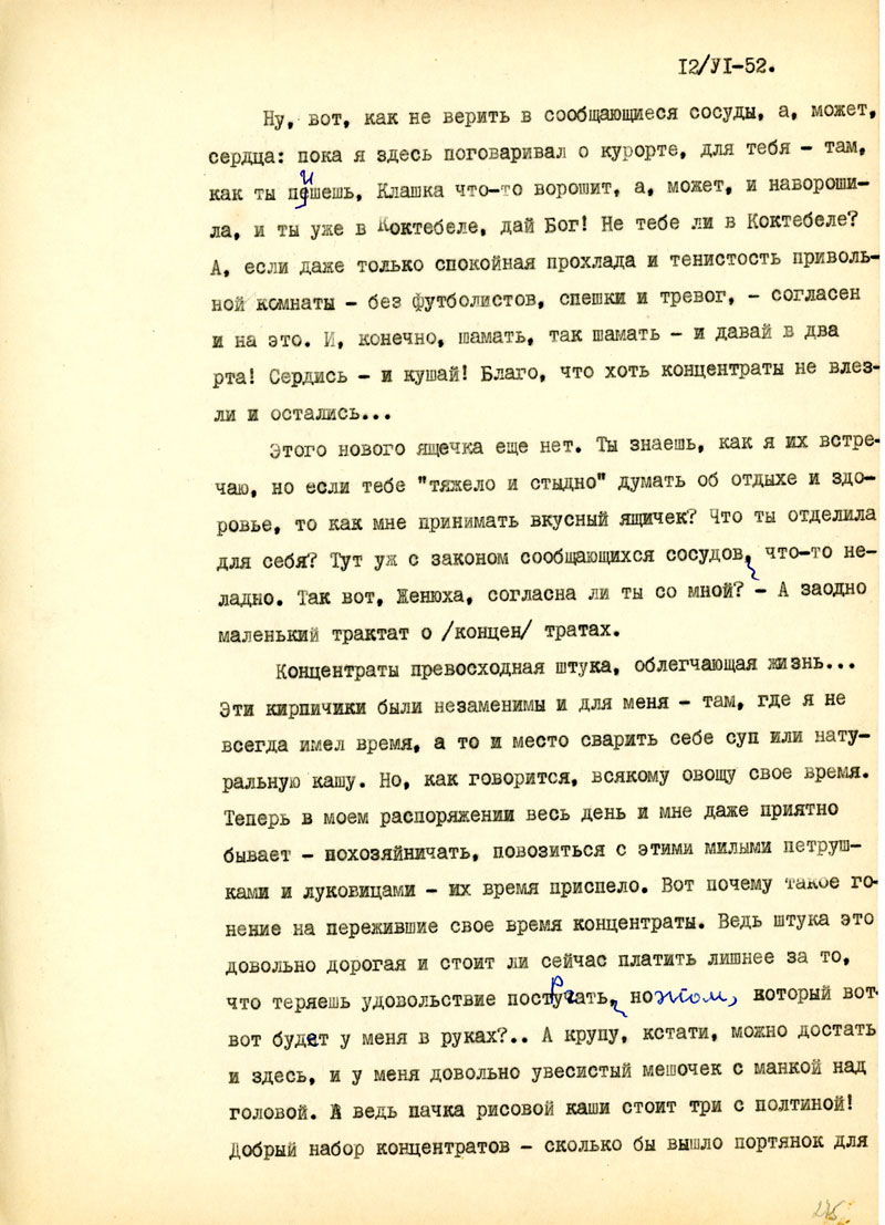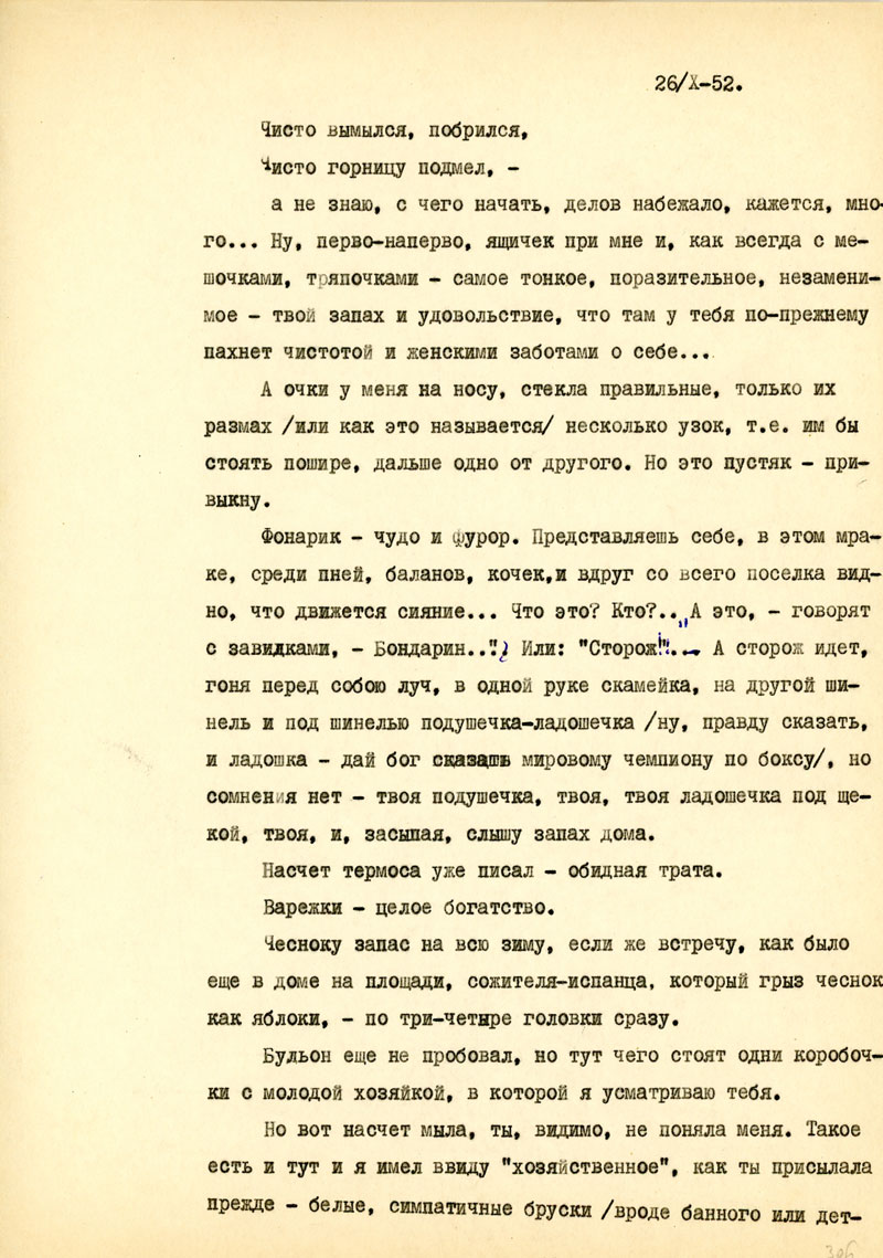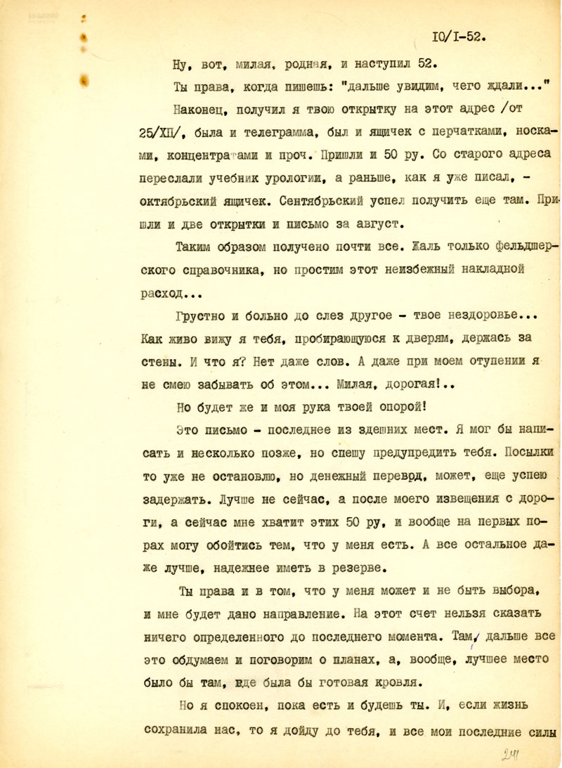 Наконец, получил я твою открытку на этот адрес /от 25/ХII, была и телеграмма, был и ящичек с перчатками, носками, концентратами и проч. Пришли и 50 ру. Со старого адреса переслали учебник урологии, а раньше, как я уже писал, - октябрьский ящичек. Сентябрьский успел получить еще там. Пришли и две открытки и письмо за август.
