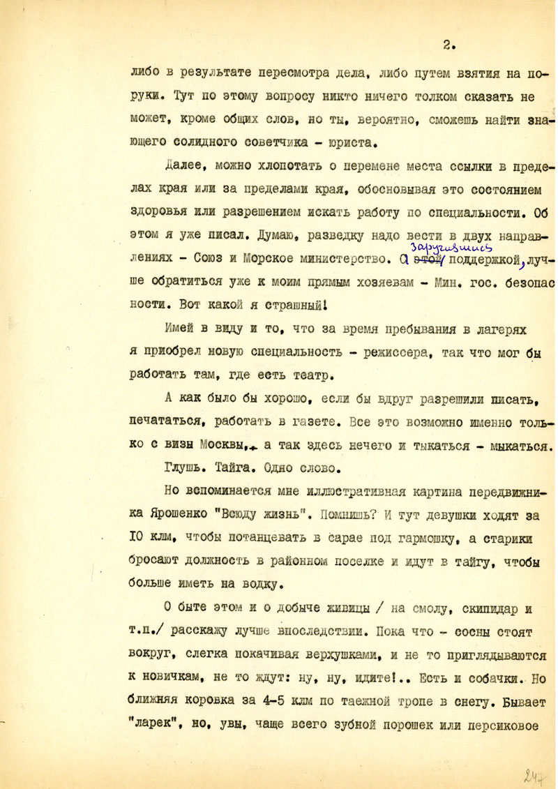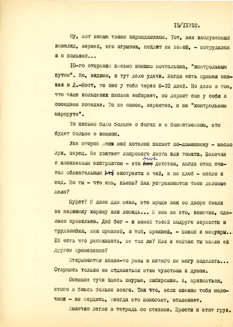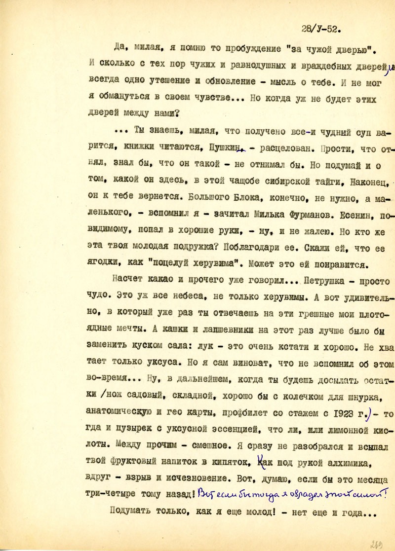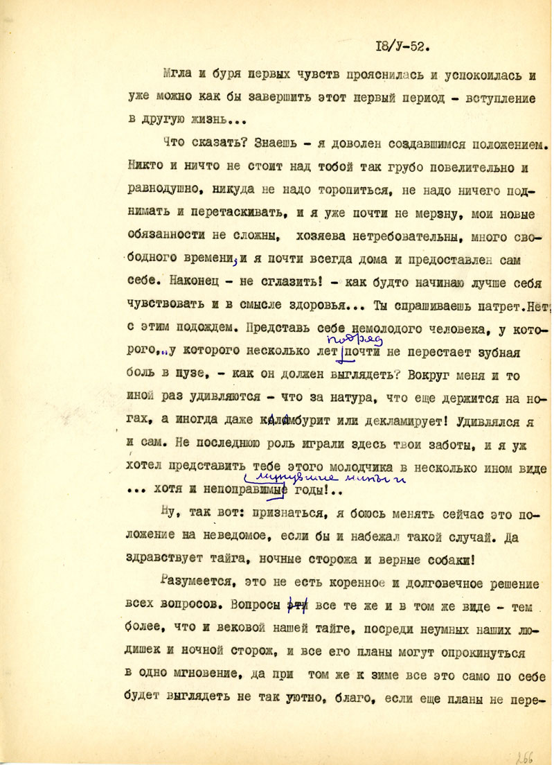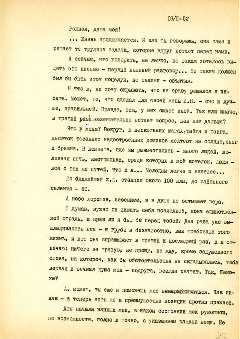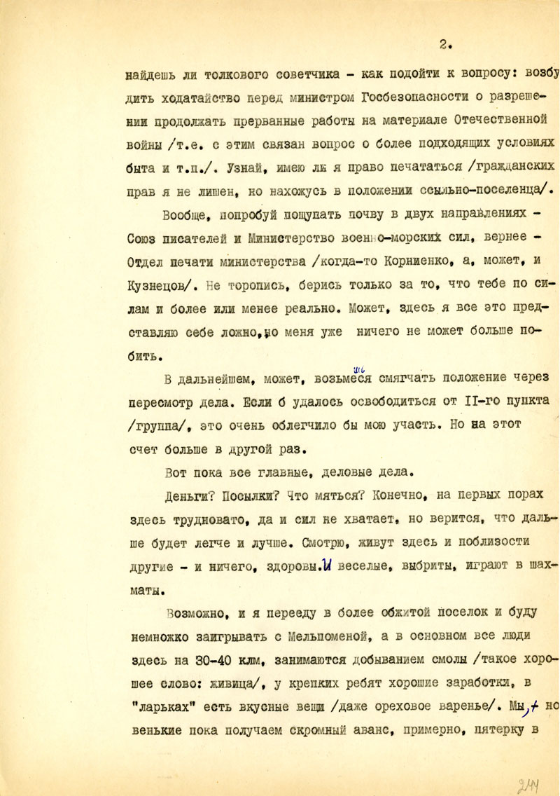 Для начала напиши мне, в каком состоянии мои рукописи, но возможности, полно и точно, с указанием каждой вещи. Не найдешь ли толкового советчика - как подойти к вопросу: возбудить ходатайство перед министром Госбезопасности о разрешении продолжать прерванные работы на материале Отечественной войны /т.е. с этим связан вопрос о более подходящих условиях быта и т.п./. Узнай, имею ли я право печататься /гражданских прав я не лишен, но нахожусь в положении ссыльно-поселенца/.
