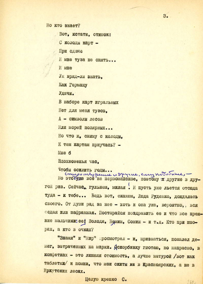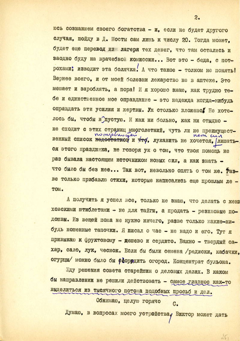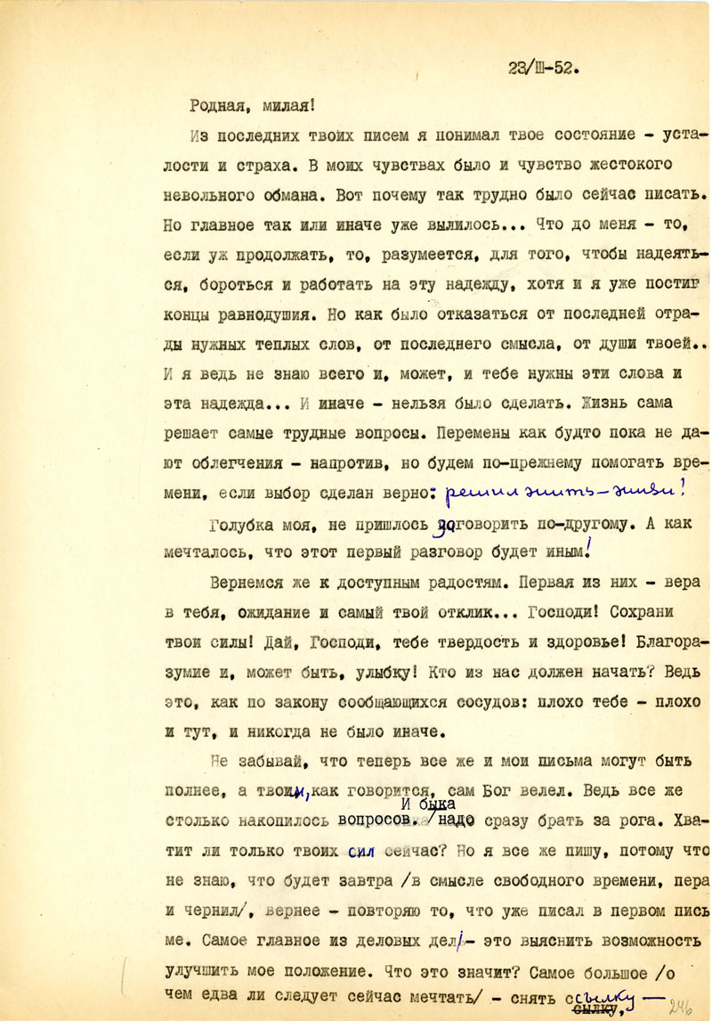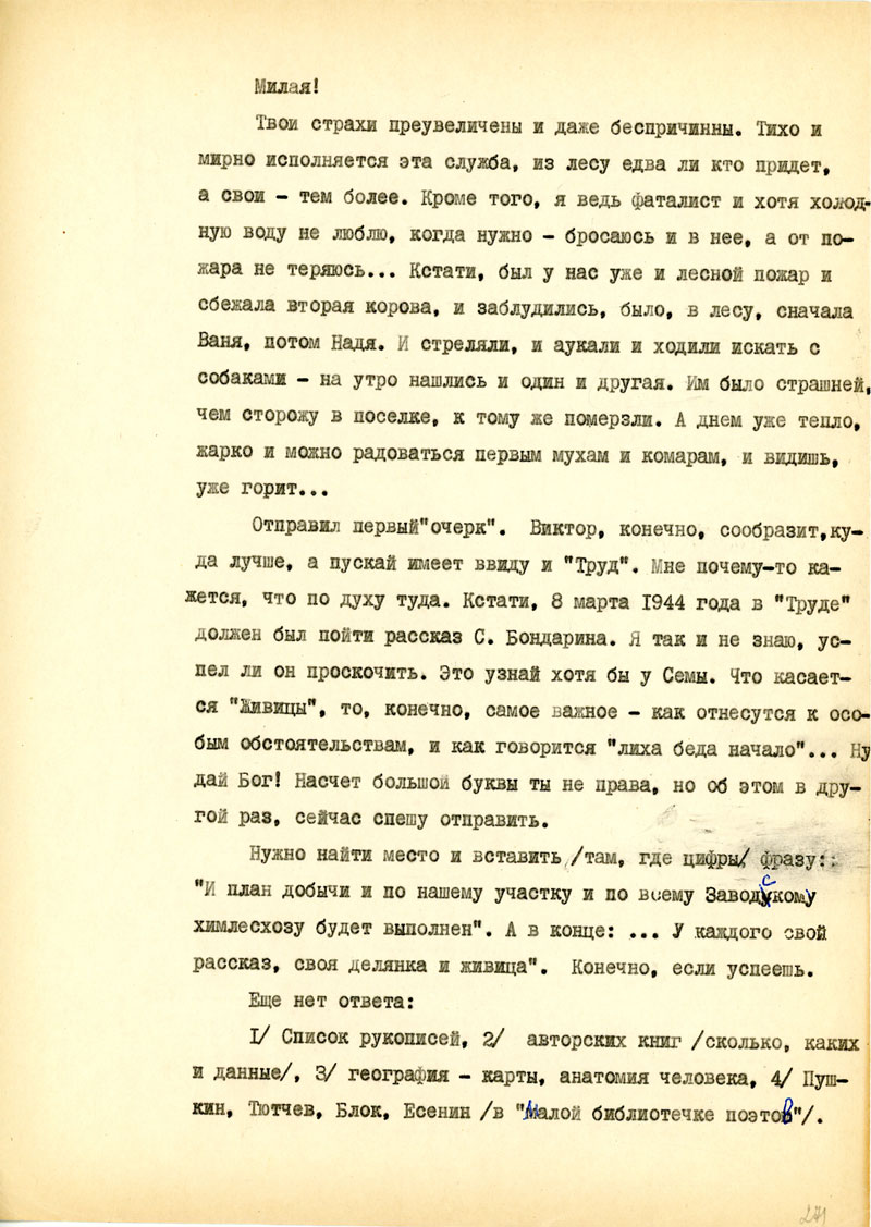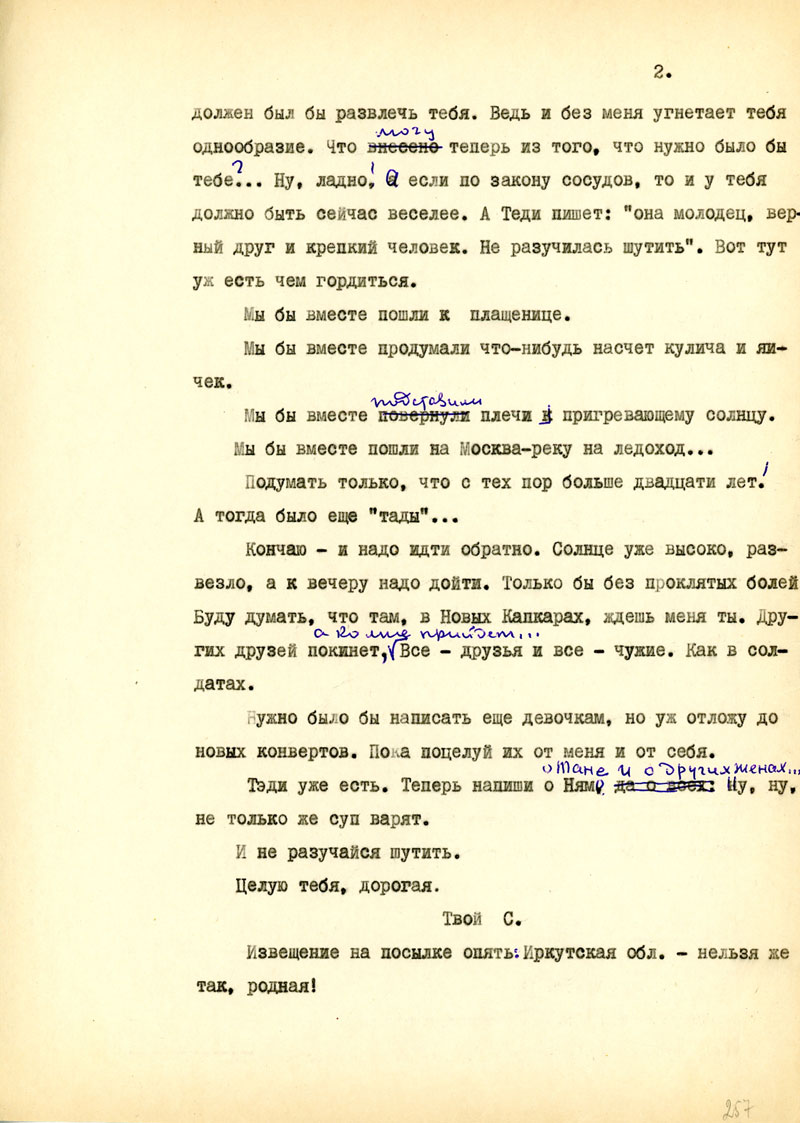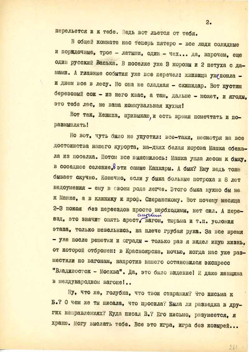 Для начала напиши мне, в каком состоянии мои рукописи, но возможности, полно и точно, с указанием каждой вещи. Не найдешь ли толкового советчика - как подойти к вопросу: возбудить ходатайство перед министром Госбезопасности о разрешении продолжать прерванные работы на материале Отечественной войны /т.е. с этим связан вопрос о более подходящих условиях быта и т.п./. Узнай, имею ли я право печататься /гражданских прав я не лишен, но нахожусь в положении ссыльно-поселенца/.