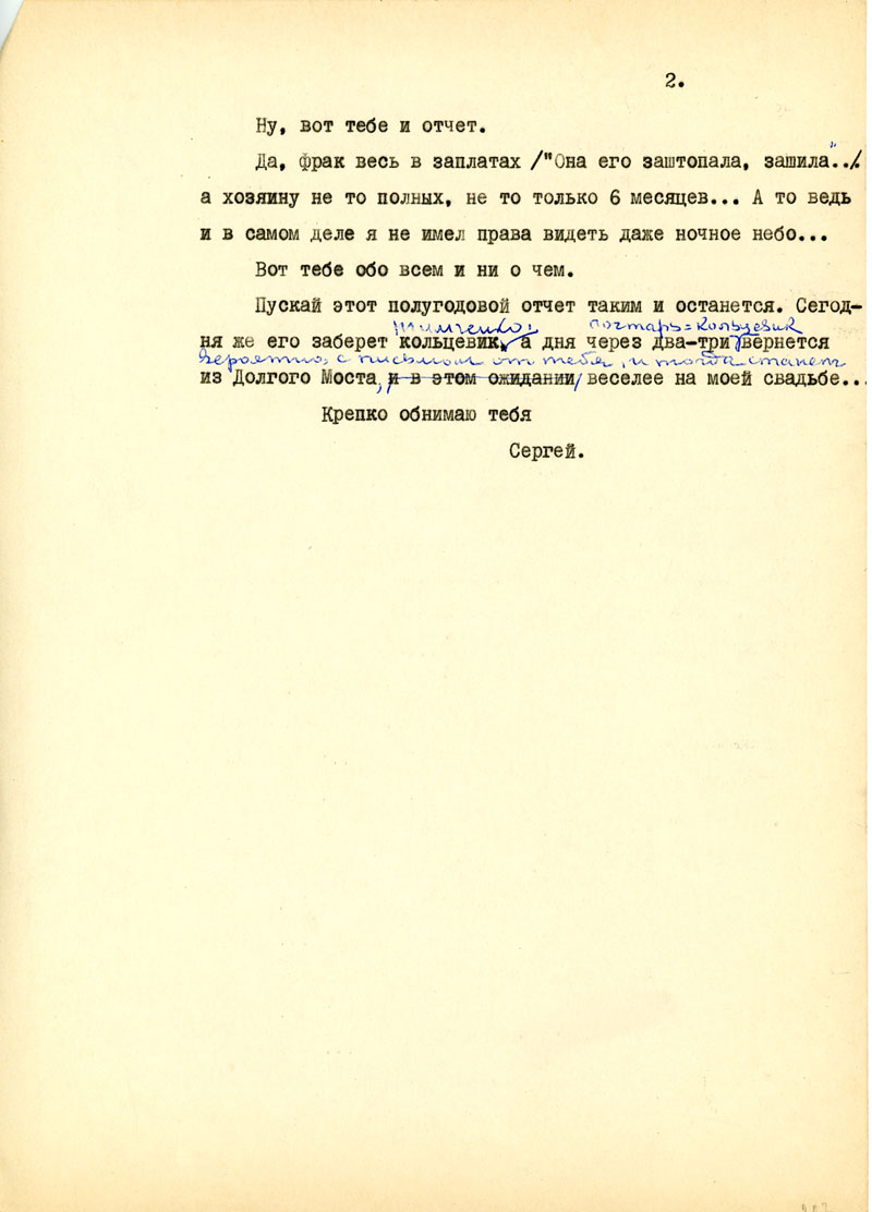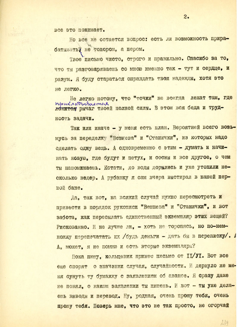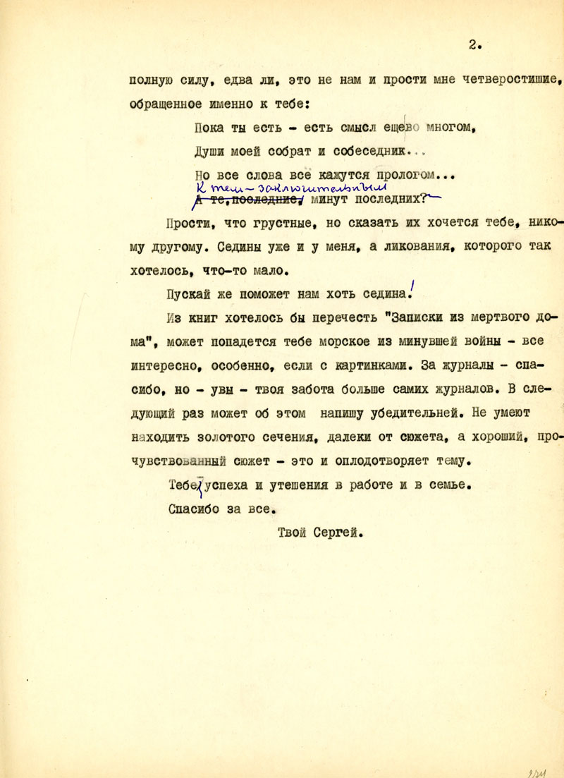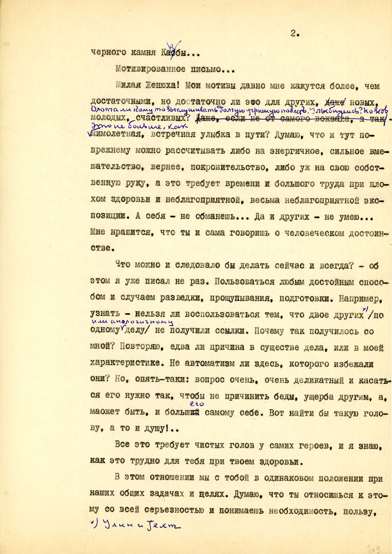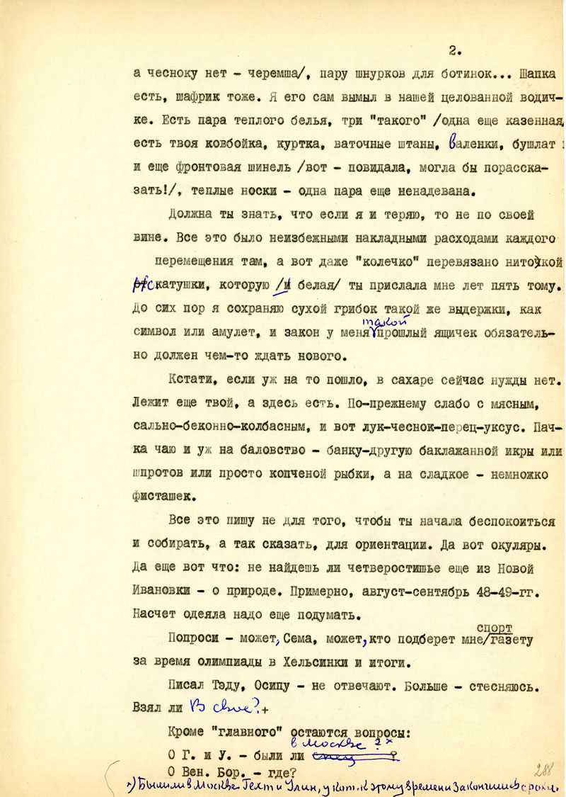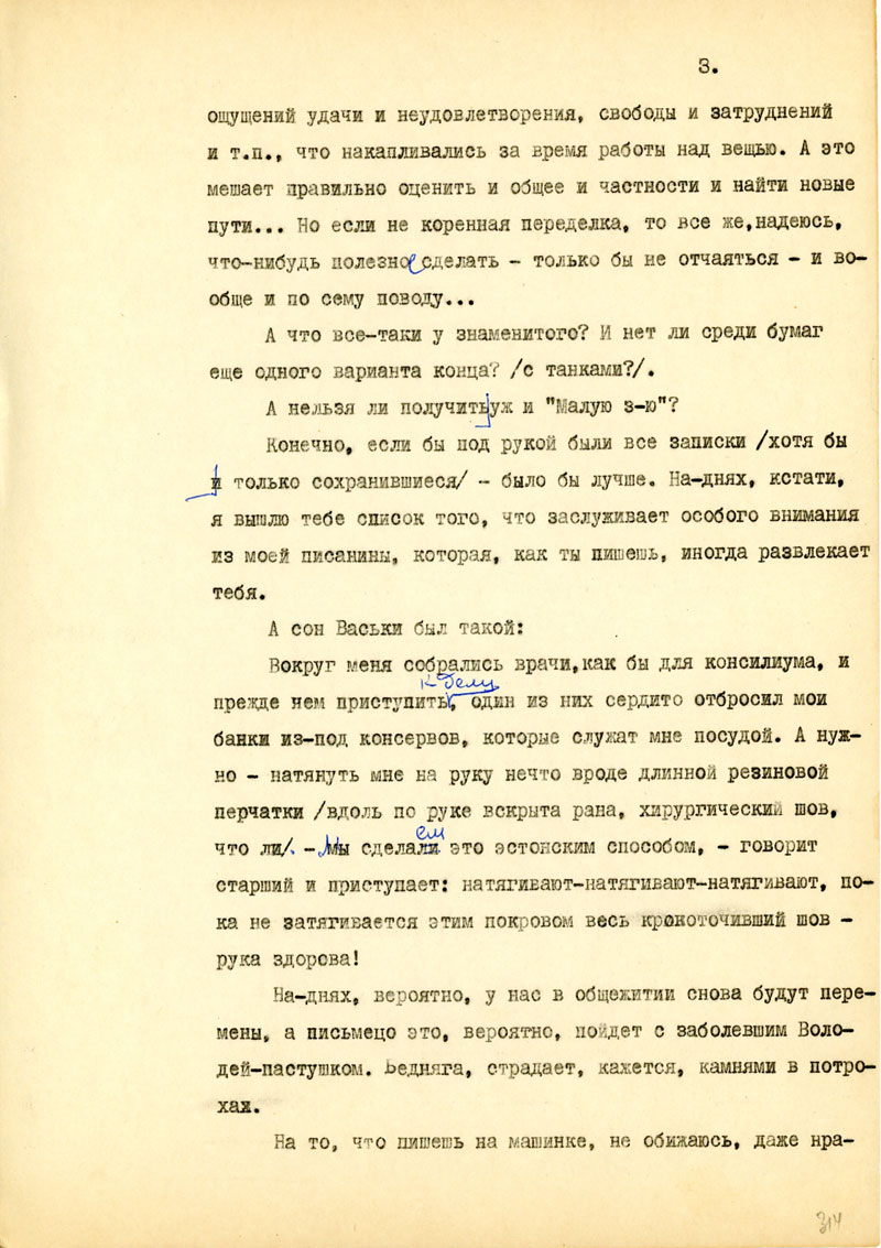 Для начала напиши мне, в каком состоянии мои рукописи, но возможности, полно и точно, с указанием каждой вещи. Не найдешь ли толкового советчика - как подойти к вопросу: возбудить ходатайство перед министром Госбезопасности о разрешении продолжать прерванные работы на материале Отечественной войны /т.е. с этим связан вопрос о более подходящих условиях быта и т.п./. Узнай, имею ли я право печататься /гражданских прав я не лишен, но нахожусь в положении ссыльно-поселенца/.