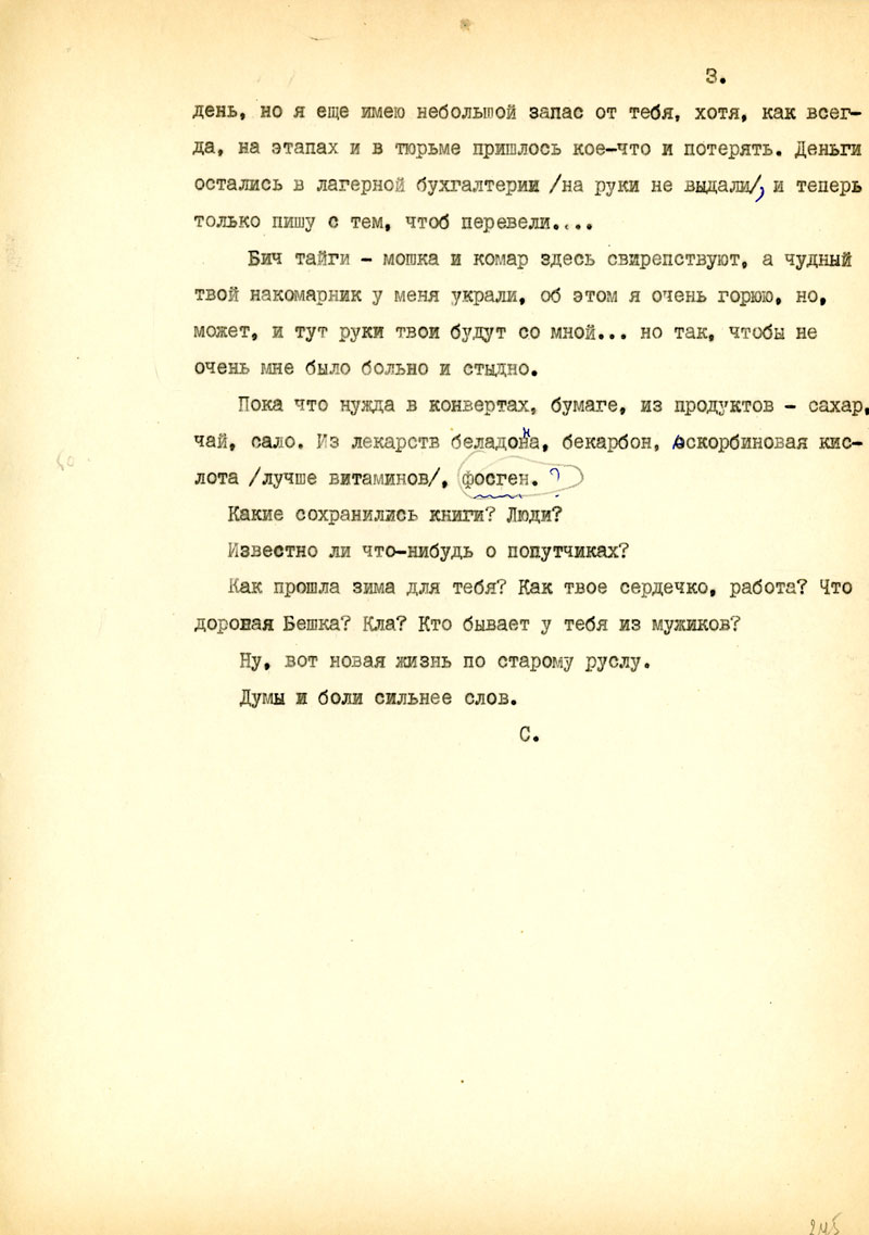 Пока что нужда в конвертах, бумаге, из продуктов - сахар чай, сало. Из лекарств беладонна, бекарбон, аскорбиновая кислота /лучше витаминов/, фосген (?)