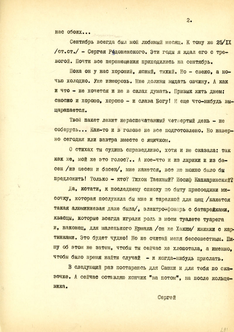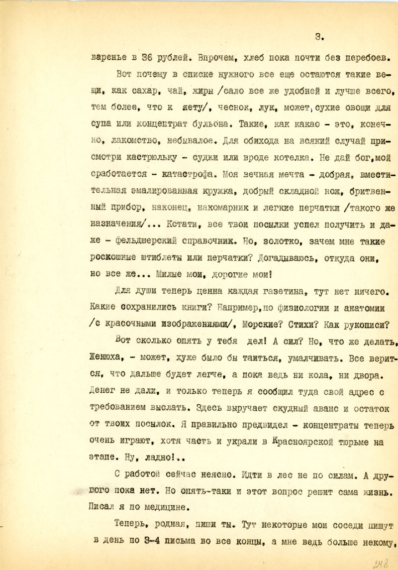 А получить я успел все, только не знаю, что делать с жениховскими штиблетами - не для тайги, а продать - резиновые подошвы. Из вещей пока не нужно ничего, разве только какие-нибудь ношенные тапочки. Я писал о чае - не надо и его. Тут я привыкаю к фруктовому - дешево и сердито. Важно - твердый сахар, сало, лук, чеснок. Если бы были семена /редиски, кабачки, огурцы/ можно было бы городить огород. Концентрат бульона.