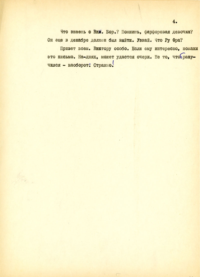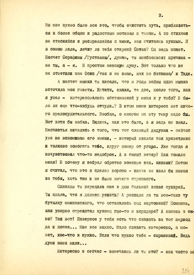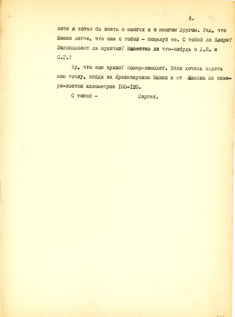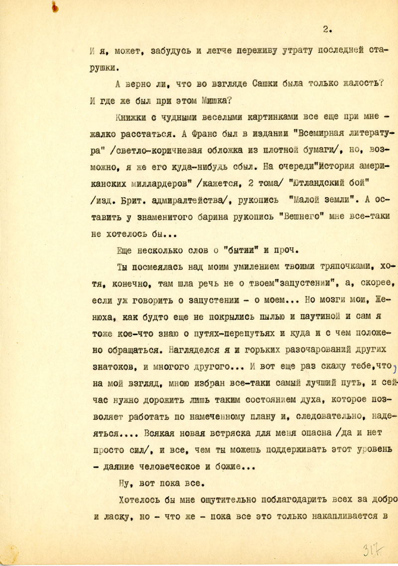 Какие сохранились книги? Люди? Известно ли что-нибудь о попутчиках? Как прошла зима для тебя? Как твое сердечко, работа? Что здоровая Бешка? Кла? Кто бывает у тебя из мужиков?