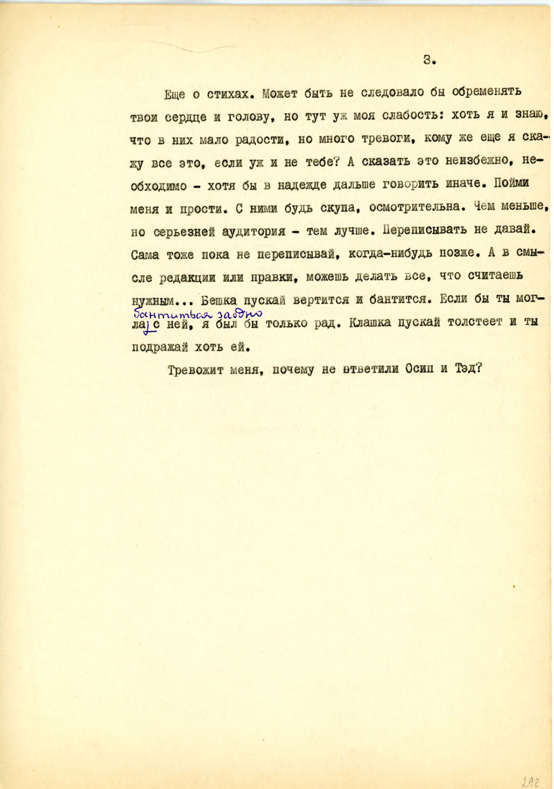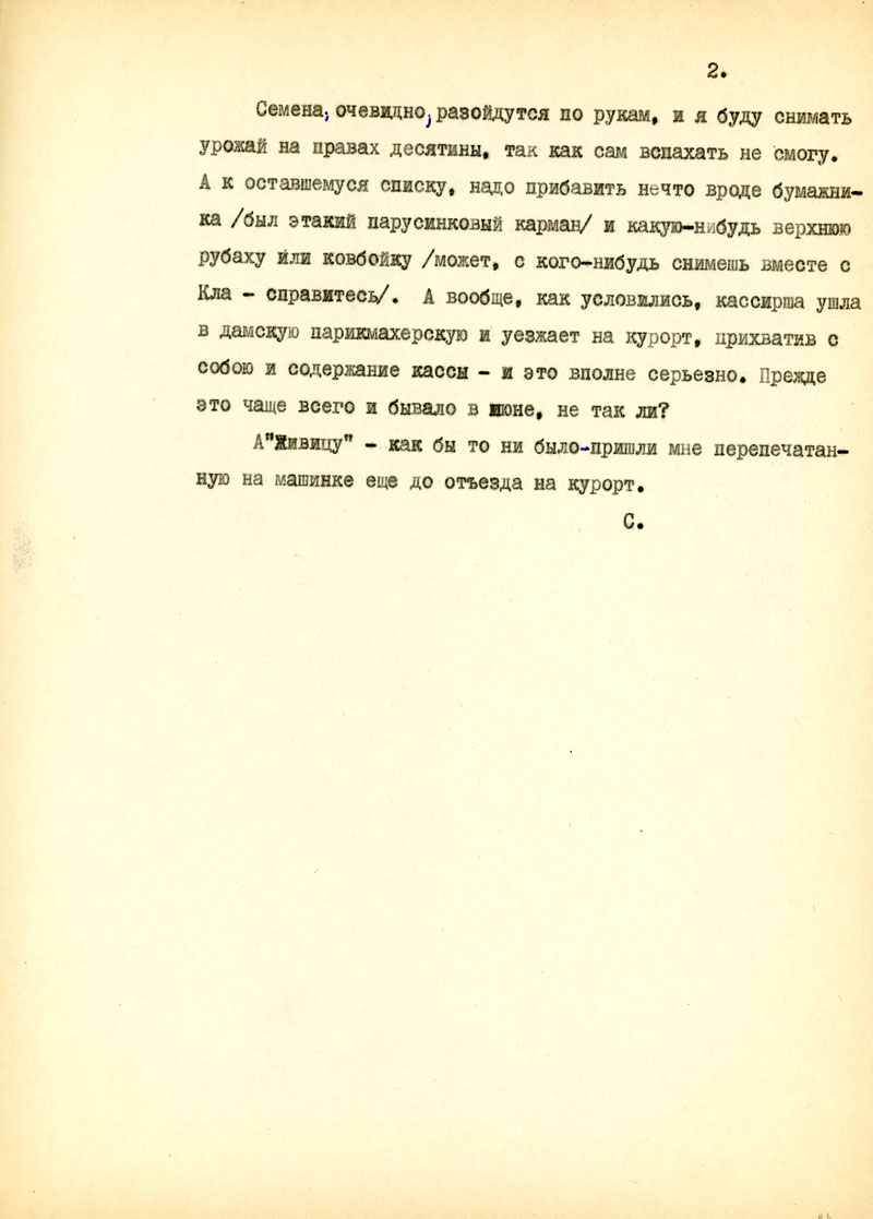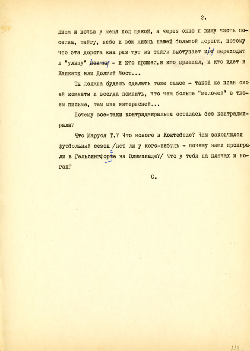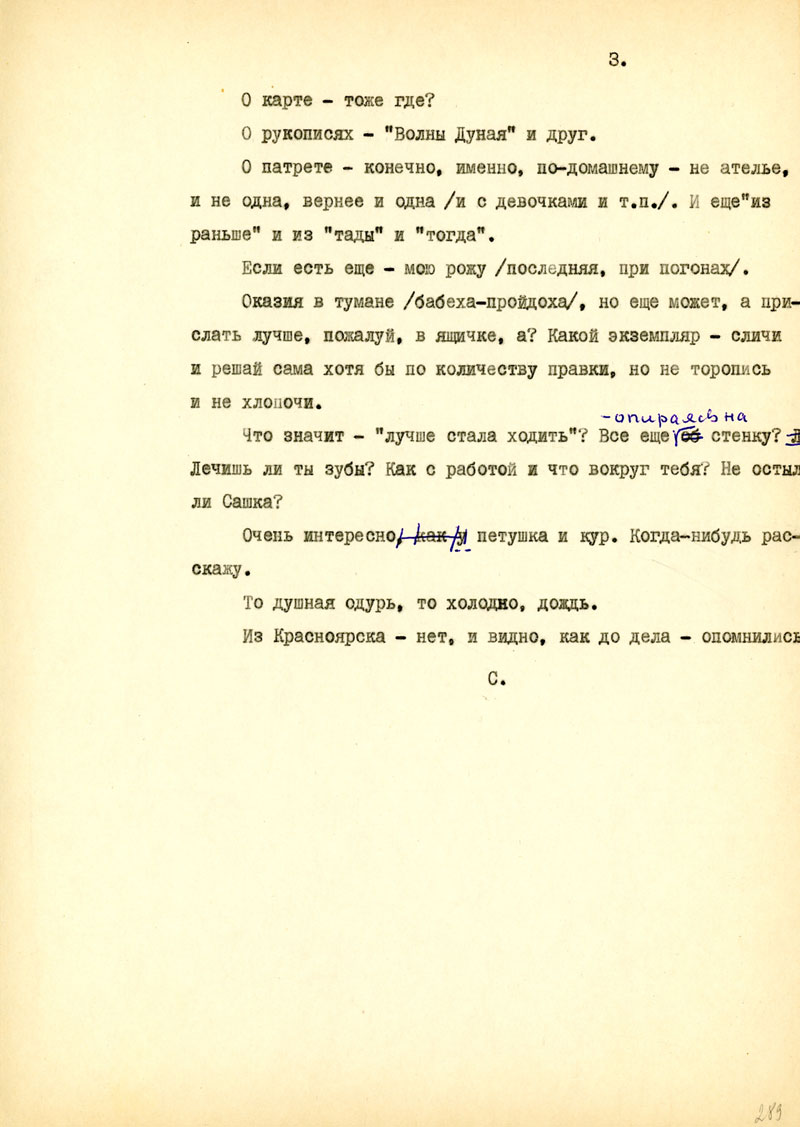 Какие сохранились книги? Люди? Известно ли что-нибудь о попутчиках? Как прошла зима для тебя? Как твое сердечко, работа? Что здоровая Бешка? Кла? Кто бывает у тебя из мужиков?