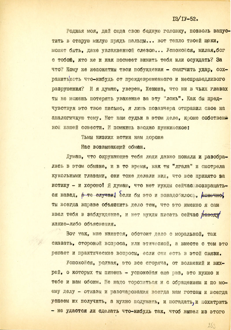 Родная моя, дай сюда свою бедную головку, позволь запустить в старую милую прядь пальцы... вот тепло твоей щеки, может быть, даже увлажненной слезою... Успокойся, милая, бог с тобой, кто же и как посмеет винить тебя или осуждать? За что? Кому же непонятны твои побуждения - смягчить удар, сохранить хоть что-нибудь от преждевременного и несправедливого разрушения? И я думаю, уверен, Женюха, что ни в чьих глазах ты не можешь потерять уважение за эту "ложь". Как бы предчувствуя это твое письмо, я лишь позавчера отправил свое на аналогичную тему. Нет нам судьи в этом деле, кроме собственной нашей совести. И помнишь заодно пушкинское: Тьмы низких истин нам дороже Нас возвышающий обман.