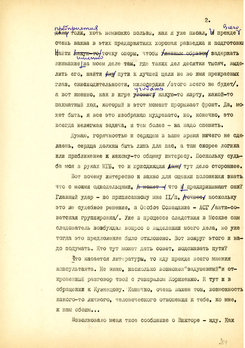 Вот почему интересно и важно для оценки положения знать, что с моими однодельцами, что предпринимают они? Главный удар - по приписанному мне 11/п, поскольку это не судебное решение, а Особое Совещание - АСГ /анти-советская группировка/. Уже в процессе следствия в Москве сам следователь возбуждал вопрос о выделении моего дела, но уже тогда это предложение было отклонено. Вот вокруг этого и надо подумать. Кто тут может дать совет, подсказать пути?
