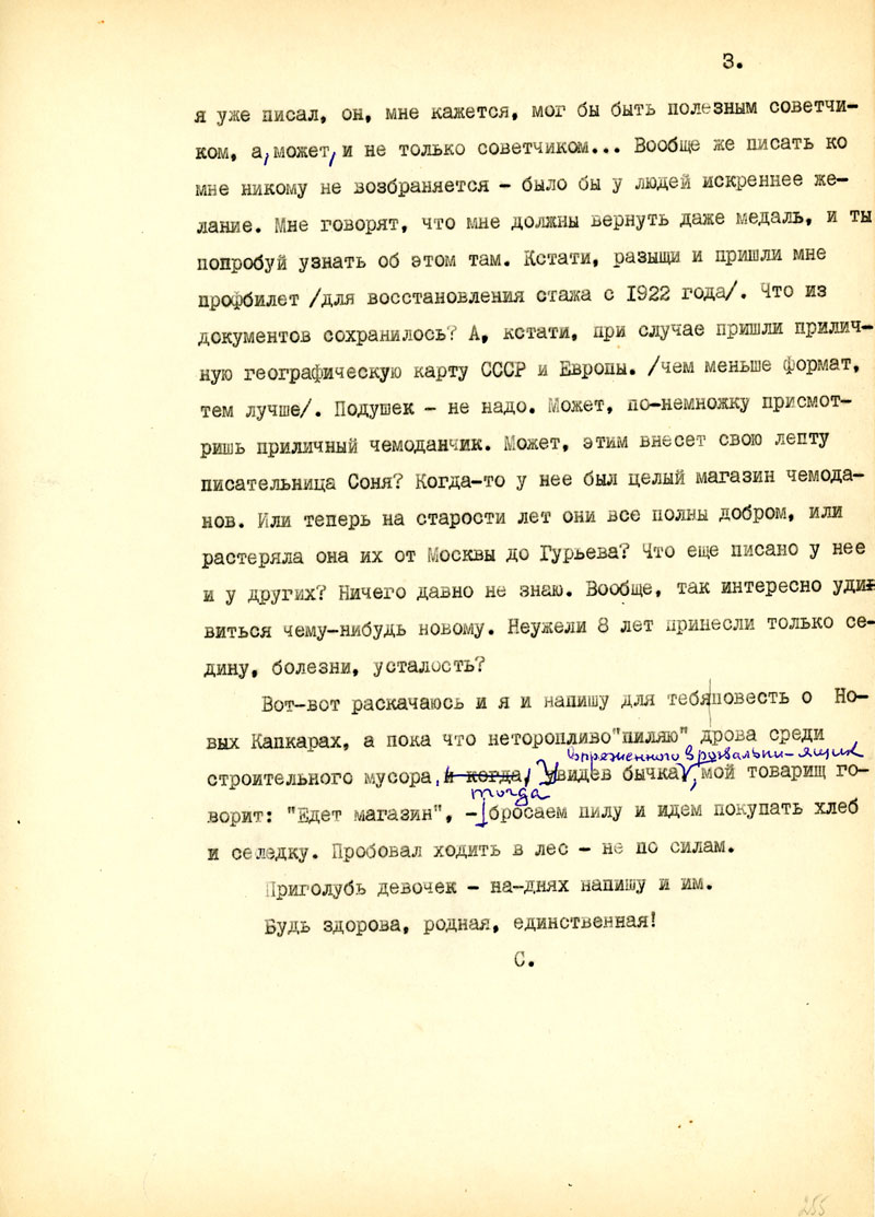 Взволновало меня твое сообщение о Викторе - жду. Как я уже писал, он, мне кажется, мог бы быть полезным советчиком, а, может, и не только советчиком... Вообще же писать ко мне никому не возбраняется - было бы у людей искреннее желание. Мне говорят, что мне должны вернуть даже медаль, и ты попробуй узнать об этом там. Кстати, разыщи и пришли мне профбилет /для восстановления стажа с 1922 года/. Что из документов сохранилось? А, кстати, при случае пришли приличную географическую карту СССР и Европы, /чем меньше формат, тем лучше/. Подушек - не надо. Может, по-немножку присмотришь приличный чемоданчик. Может, этим внесет свою лепту писательница Соня? Когда-то у нее был целый магазин чемода¬нов. Или теперь на старости лет они все полны добром, или растеряла она их от Москвы до Гурьева? Что еще писано у нее и у других? Ничего давно не знаю. Вообще, так интересно удивиться чему-нибудь новому. Неужели 8 лет принесли только се¬дину, болезни, усталость?