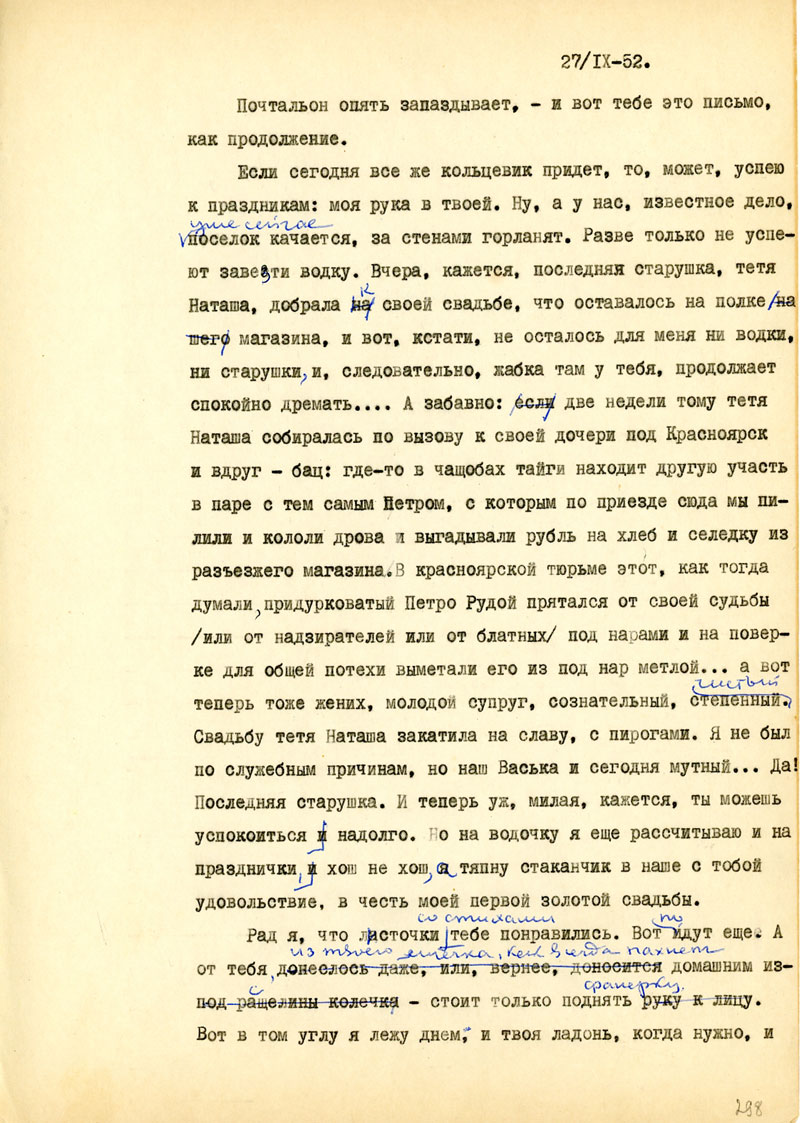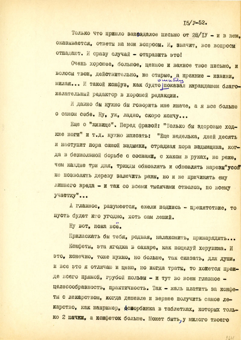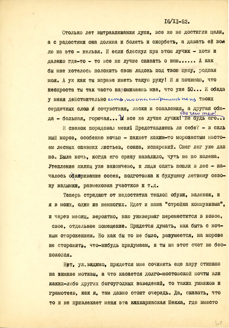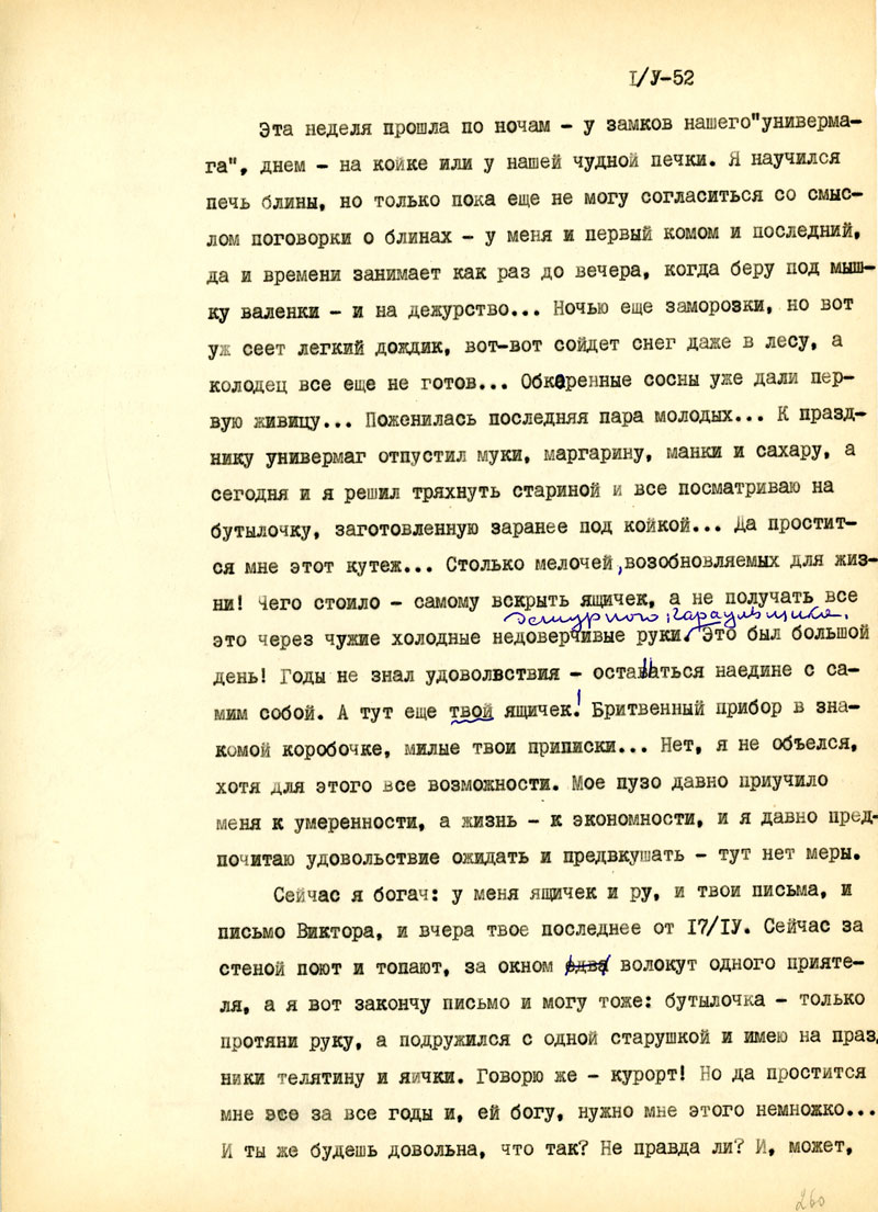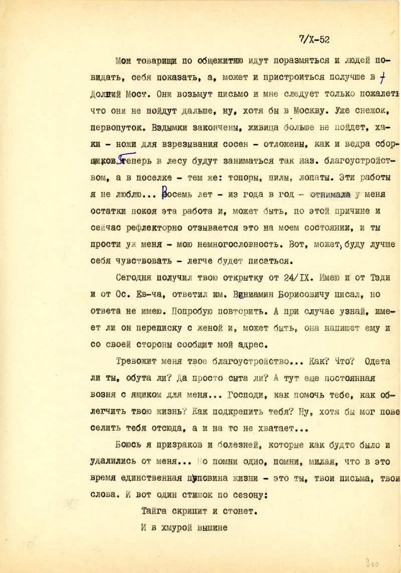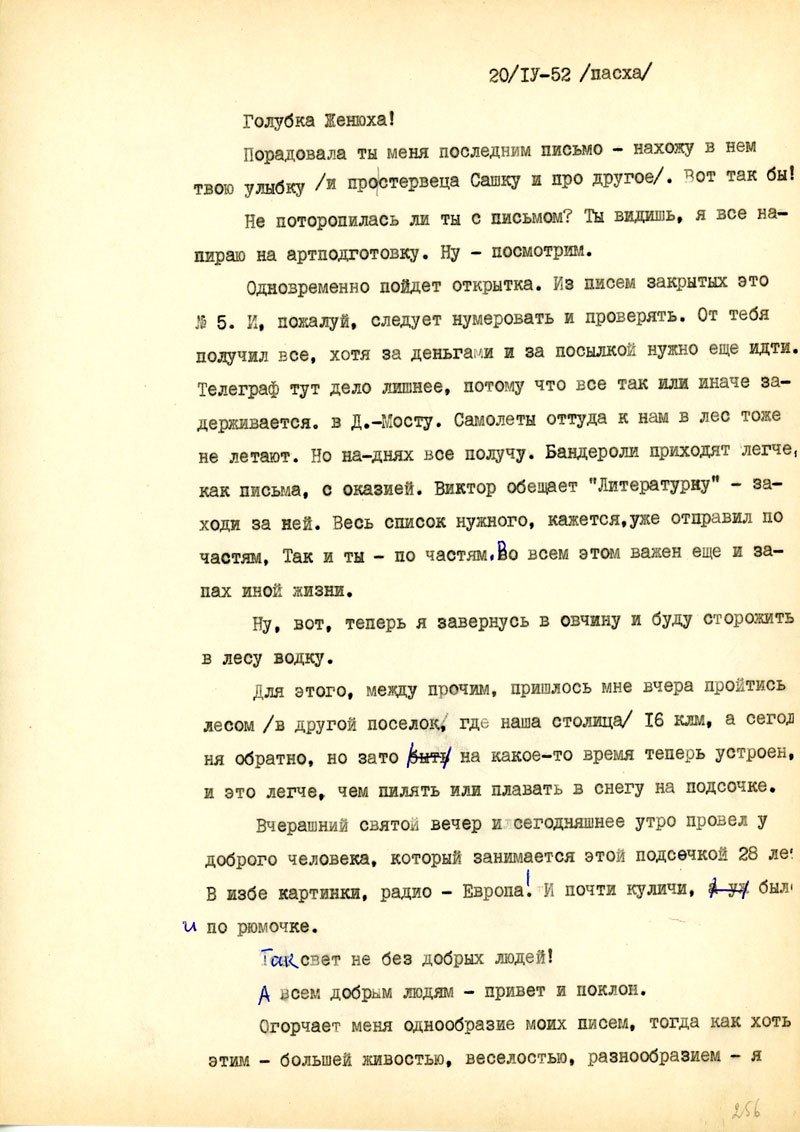 Возможно, и я перееду в более обжитой поселок и буду немножко заигрывать с Мельпоменой, а в основном все люди здесь на 30-40 клм, занимаются добыванием смолы /такое хорошее слово: живица/, у крепких ребят хорошие заработки, в "ларьках" есть вкусные вещи /даже ореховое варенье/. Мы, новенькие пока получаем скромный аванс, примерно, пятерку в день, но я еще имею небольшой запас от тебя, хотя, как всегда, на этапах и в тюрьме пришлось кое-что и потерять. Деньги остались в лагерной бухгалтерии /на руки не выдали/, и теперь только пишу с тем, чтоб перевели...