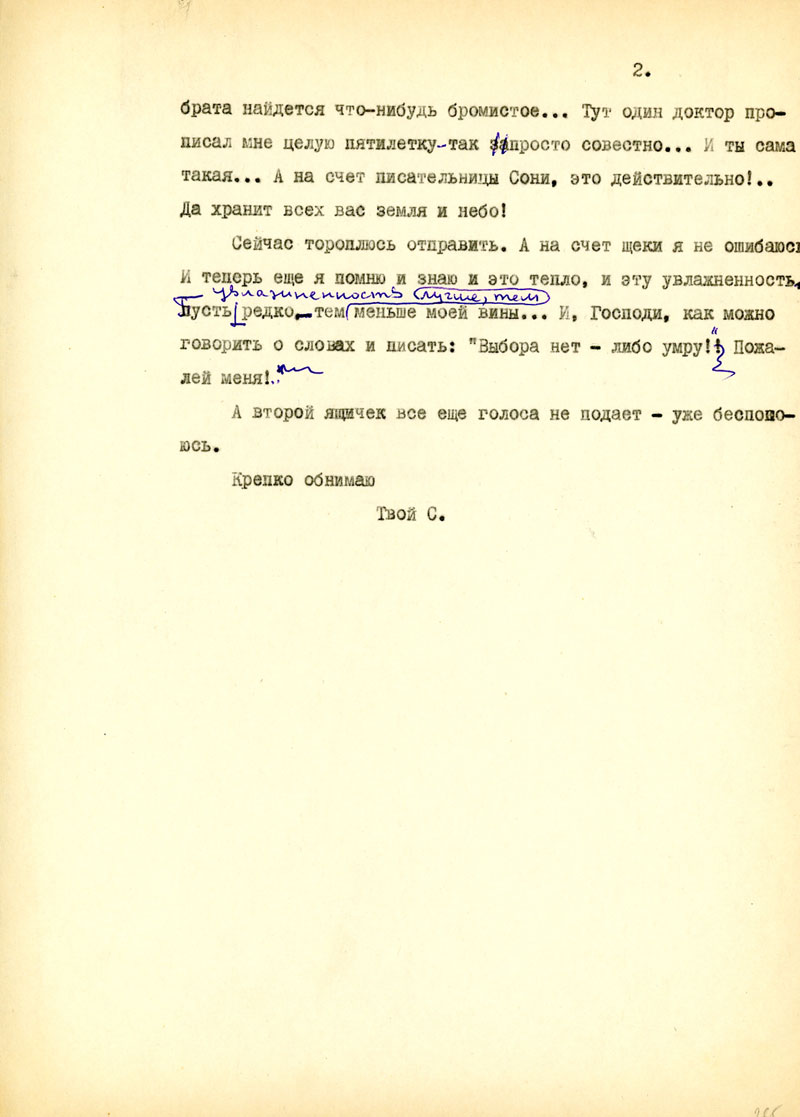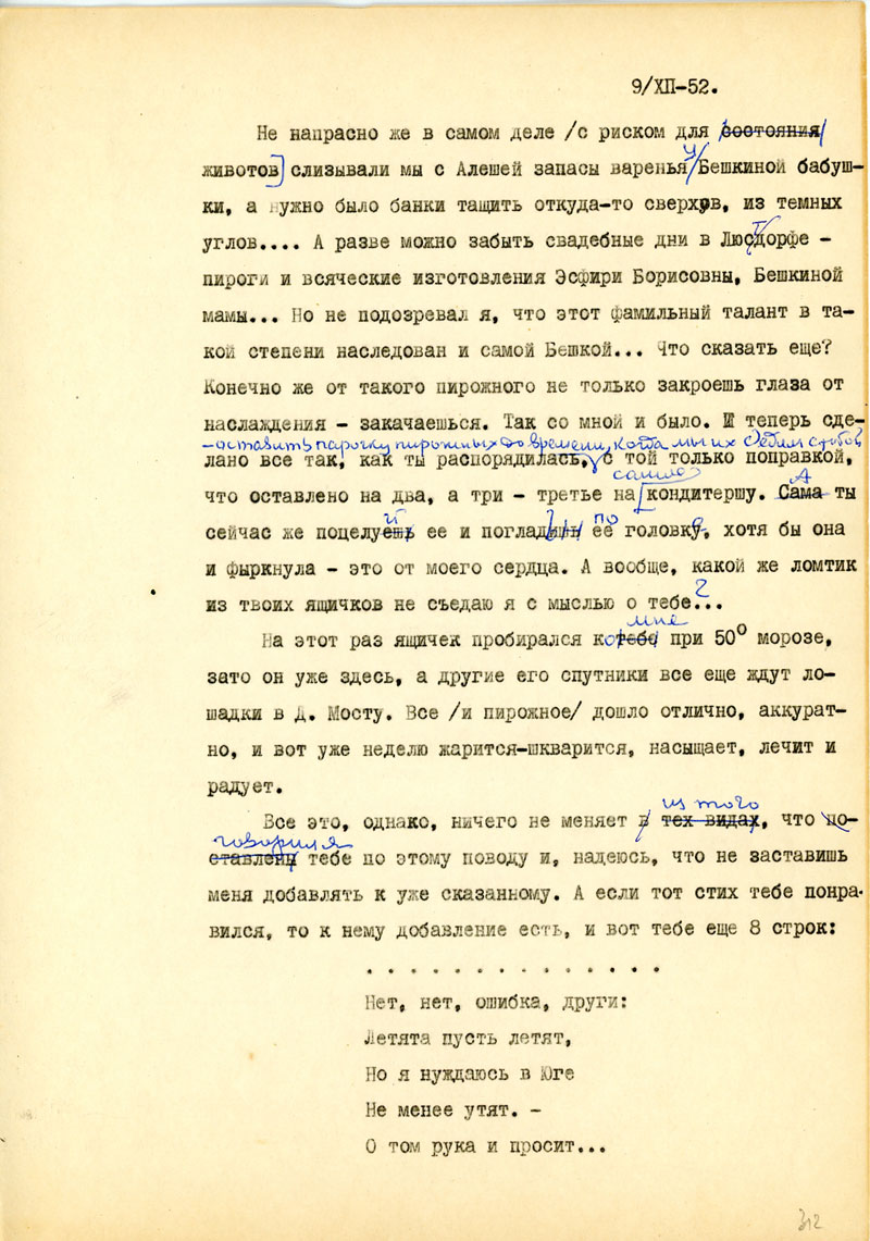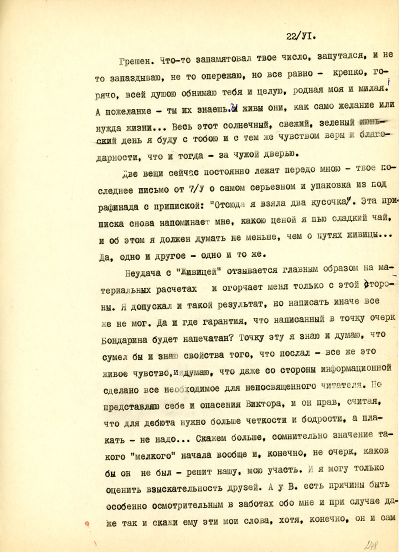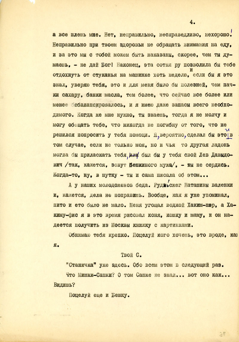 И последнее из деловых дел: Ты хорошо знаешь, какое значение имеют для меня твои ящички. Это не только для брюха, но и для духа. Но вместе с радостью они приносят для меня и страдания, и ты делаешь неправильно, когда отказываешь себе в пачке сахару или банке масла, а все шлешь мне. Нет, неправильно, несправедливо, нехорошо. Неправильно при твоем здоровьи не обращать внимания на еду, и за это мы с тобой можем быть наказаны, скорее, чем ты думаешь, - не дай Бог! Наконец, эта сотня ру позволила бы тебе отдохнуть от стуканья на машинке хоть неделю, если бы я это знал, уверяю тебя, это и для меня было бы полезней, чем пачки сахару, банки масла, тем более, что сейчас все более или менее сбалансировалось, и я имею даже запасы всего необходимого. Когда же мне нужно, ты знаешь, тогда я не молчу и могу обещать тебе, что никогда не погибну от того, что не решился попросить у тебя помощи. Я, вероятно, сделал бы это в том случае, если не только моя, но и чья то другая ладонь могла бы приласкать тебя, был бы у тебя свой Лев Давидович /так, кажется, зовут Бешкиного мужа/, - ты не сердись.