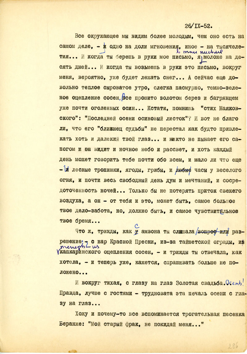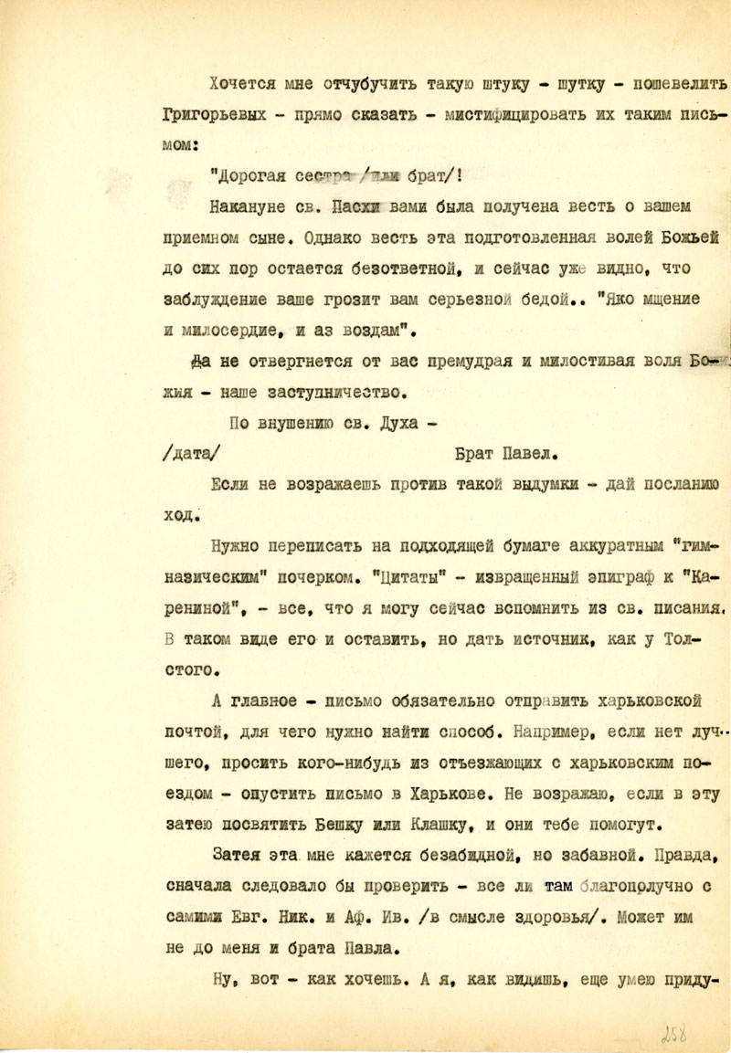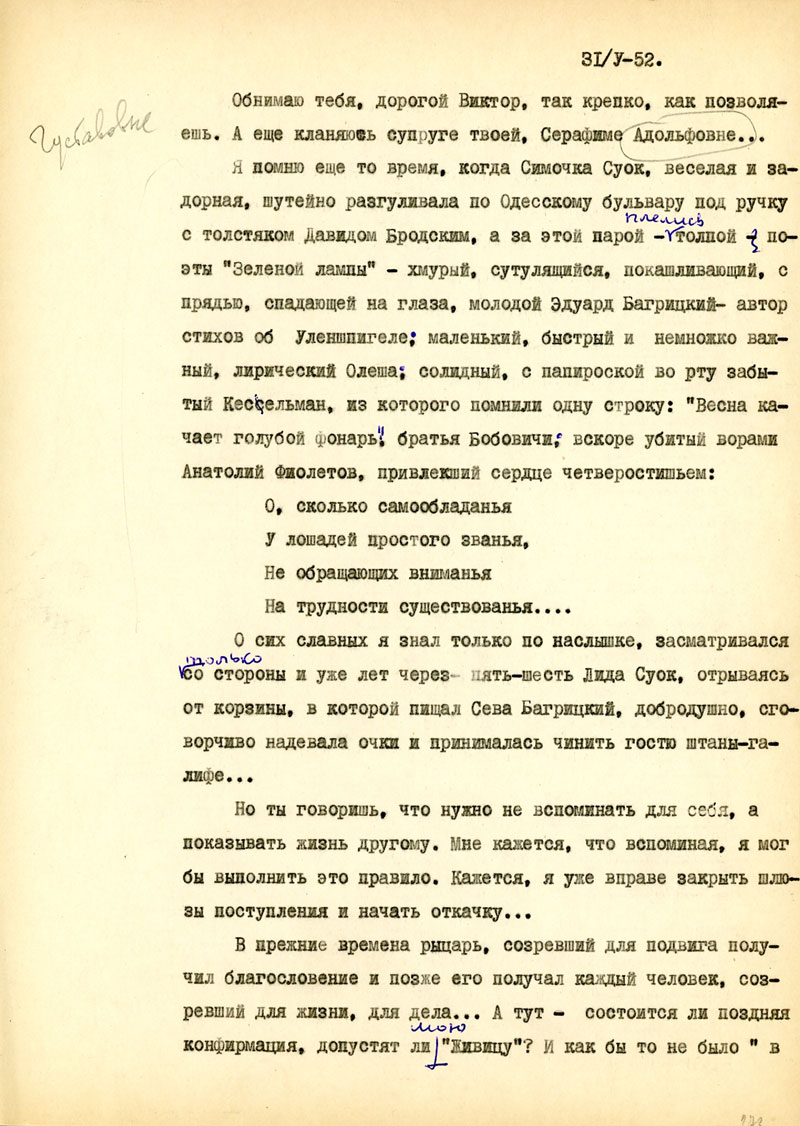 И последнее из деловых дел: Ты хорошо знаешь, какое значение имеют для меня твои ящички. Это не только для брюха, но и для духа. Но вместе с радостью они приносят для меня и страдания, и ты делаешь неправильно, когда отказываешь себе в пачке сахару или банке масла, а все шлешь мне. Нет, неправильно, несправедливо, нехорошо. Неправильно при твоем здоровьи не обращать внимания на еду, и за это мы с тобой можем быть наказаны, скорее, чем ты думаешь, - не дай Бог! Наконец, эта сотня ру позволила бы тебе отдохнуть от стуканья на машинке хоть неделю, если бы я это знал, уверяю тебя, это и для меня было бы полезней, чем пачки сахару, банки масла, тем более, что сейчас все более или менее сбалансировалось, и я имею даже запасы всего необходимого. Когда же мне нужно, ты знаешь, тогда я не молчу и могу обещать тебе, что никогда не погибну от того, что не решился попросить у тебя помощи. Я, вероятно, сделал бы это в том случае, если не только моя, но и чья то другая ладонь могла бы приласкать тебя, был бы у тебя свой Лев Давидович /так, кажется, зовут Бешкиного мужа/, - ты не сердись.