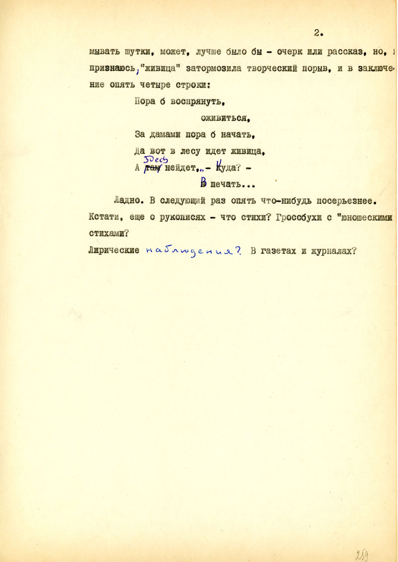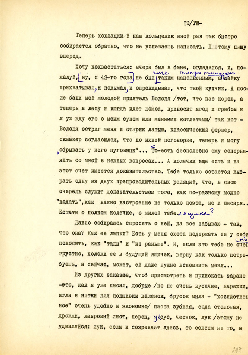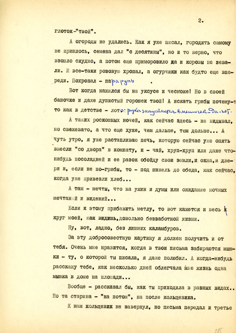 Одновременно пойдет открытка. Из писем закрытых это № 5. И, пожалуй, следует нумеровать и проверять. От тебя получил все, хотя за деньгами и за посылкой нужно еще идти. Телеграф тут дело лишнее, потому что все так или иначе задерживается. в Д.-Мосту. Самолеты оттуда к нам в лес тоже не летают. Но на-днях все получу. Бандероли приходят легче, как письма, с оказией. Виктор обещает "Литературку" - заходи за ней. Весь список нужного, кажется, уже отправил по частям. Так и ты - по частям. Во всем этом важен еще и запах иной жизни.