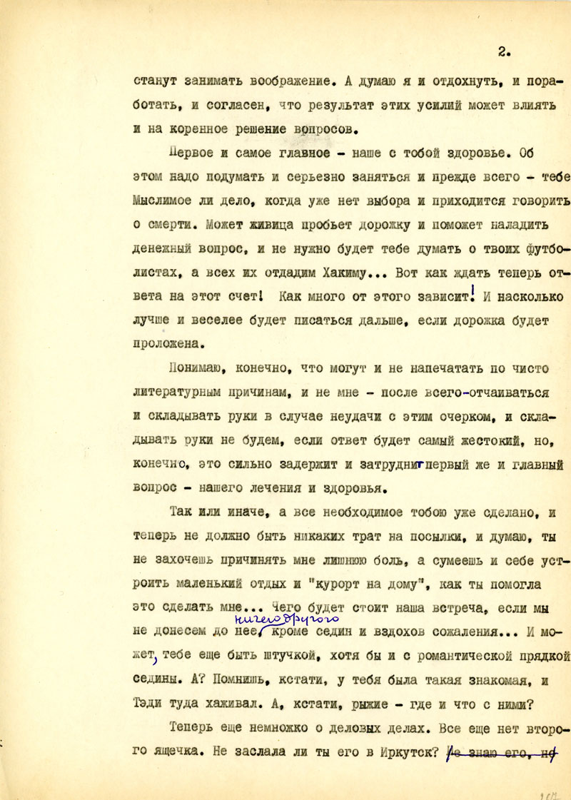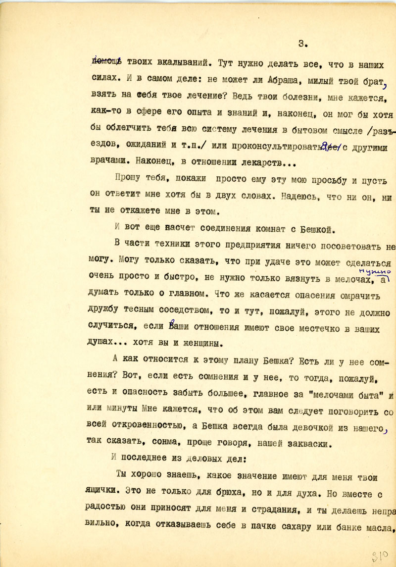 В этом отношении мы с тобой в одинаковом положении при наших общих задачах и целях. Думаю, что ты относишься к этому со всей серьезностью и понимаешь необходимость, пользу твоих вкалываний. Тут нужно делать все, что в наших силах. И в самом деле: не может ли Абраша, милый твой брат, взять на себя твое лечение? Ведь твои болезни, мне кажется, как-то в сфере его опыта и знаний и, наконец, он мог бы хотя бы облегчить тебя всю систему лечения в бытовом смысле /разъездов, ожиданий и т.п./ или проконсультироваться с другими врачами. Наконец, в отношении лекарств...