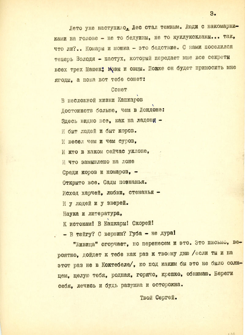 Бич тайги - мошка и комар здесь свирепствуют, а чудный твой накомарник у меня украли, об этом я очень горюю, но, может, и тут руки твои будут со мной... но так, чтобы не очень мне было больно и стыдно.
