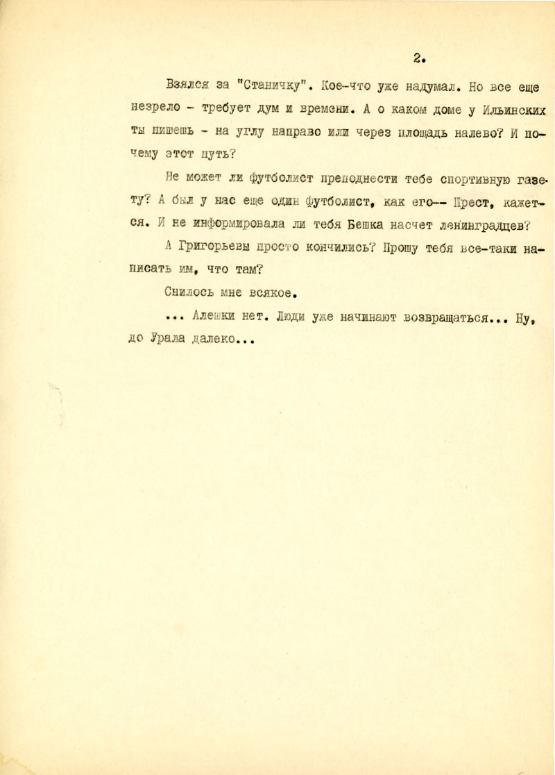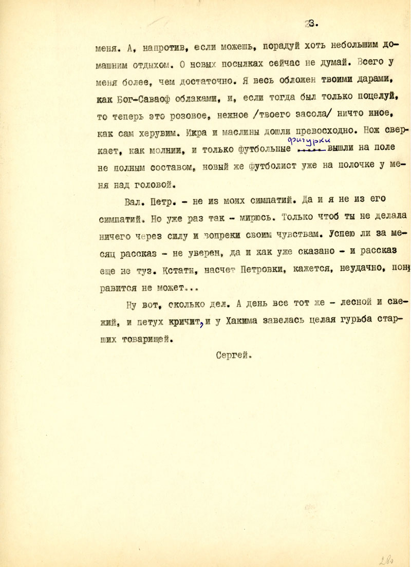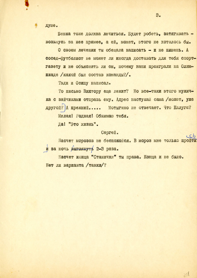 О своем лечении ты обещала написать - и не пишешь. А сосед-футболист не может ли иногда доставать для тебя спорт-газету и не объяснить ли он, почему наши проиграли на Олим¬пиаде /какой был состав команды?/. Тэди и Осипу написал.