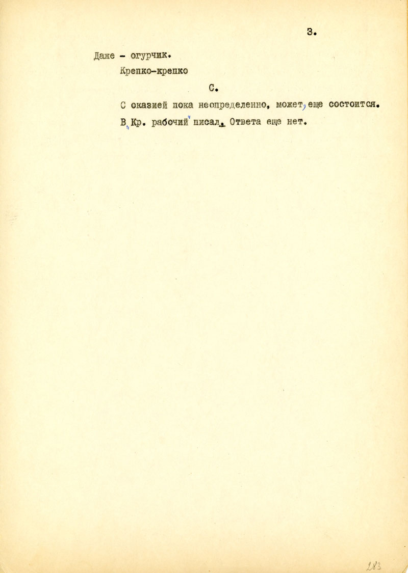 Не забывай, что теперь все же и мои письма могут быть полнее, а твоим, как говорится, сам Бог велел. Ведь все же столько накопилось вопросов. И быка надо сразу брать за рога. Хватит ли только твоих сил сейчас? Но я все же пишу, потому что не знаю, что будет завтра /в смысле свободного времени, пера и чернил/, вернее - повторяю то, что уже писал в первом письме. Самое главное из деловых дел/- это выяснить возможность