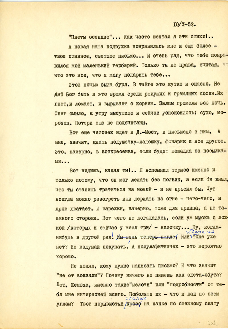 Опять немного хуже со здоровьем, но понемногу выпрямляюсь. Обстановка уже почти совсем зимняя. Мы в нашей избе тоже уже окопались и обмазались. Печь гудит и будет тепло. Запасаемся картошкой - и в подполье. Завели котенка. А у те¬бя? Ты так и не рассказываешь мне, как у тебя и что у тебя? И если дома — еще чистое и, может, достаточно теплое, то в чем выходишь? А мне так и не наслать тебе из моих дебрей хотя бы белячьих шкурок, и, действительно, эти листочки - все, что я могу.