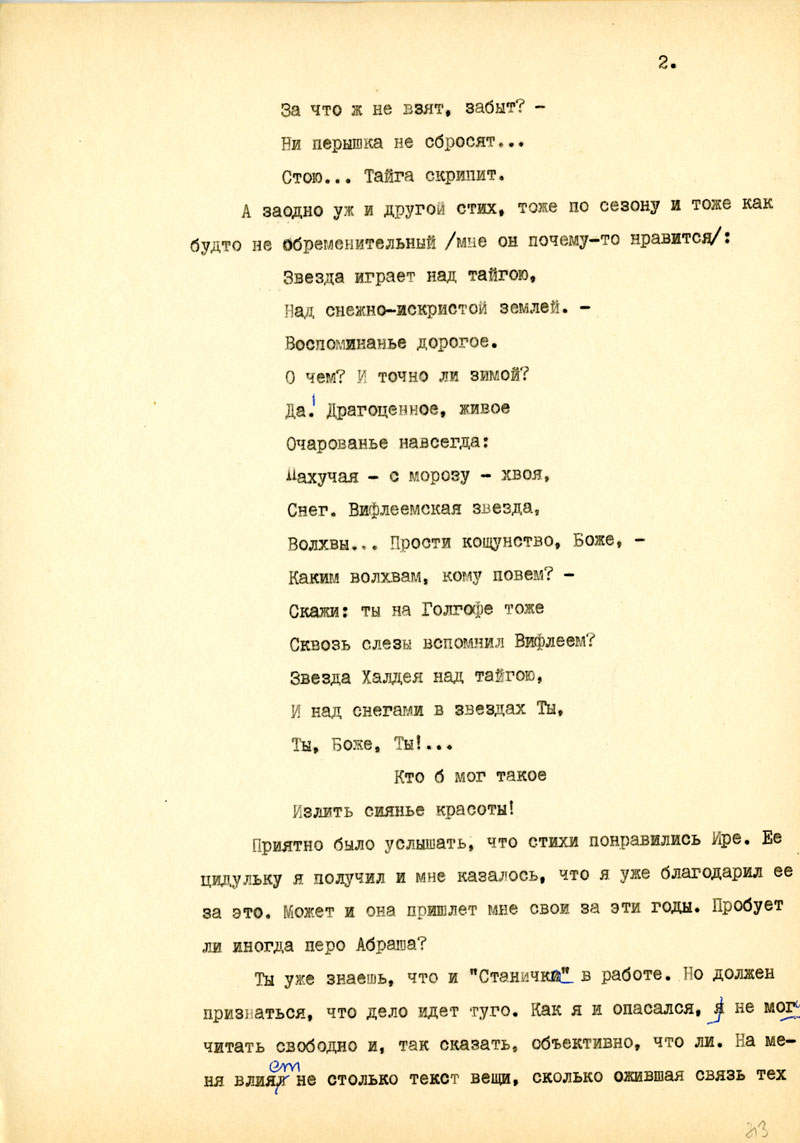 Ты уже знаешь, что и "Станичка" в работе. Но должен признаться, что дело идет туго. Как я и опасался, не могу читать свободно и, так сказать, объективно, что ли. На меня влияет не столько текст вещи, сколько ожившая связь тех ощущений удачи и неудовлетворения, свободы и затруднений и т.п., что накапливались за время работы над вещью. А это мешает правильно оценить и общее и частности и найти новые пути... Но если не коренная переделка, то все же, надеюсь, что-нибудь полезно сделать - только бы не отчаяться - и вообще и по сему поводу...