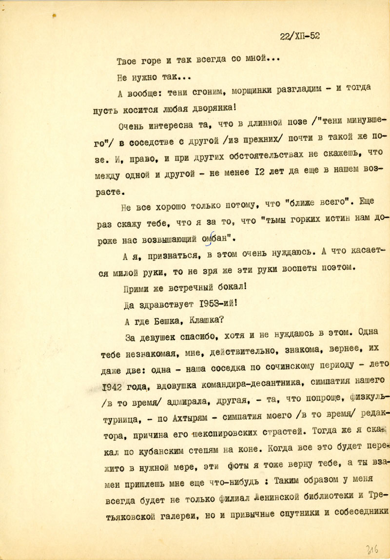 За девушек спасибо, хотя и не нуждаюсь в этом. Одна тебе незнакомая, мне, действительно, знакома, вернее, их даже две: одна - наша соседка по сочинскому периоду - лето 1942 года, вдовушка командира-десантника, симпатия нашего /в то время/ адмирала, другая, - та, что попроще, физкультурница, - по Ахтырям - симпатия моего /в то время/ редактора, причина его -шекспировских страстей. Тогда же я скакал по кубанским степям на коне. Когда все это будет пережито в нужной мере, эти фоты я тоже верну тебе, а ты взамен пришлешь мне еще что-нибудь: Таким образом у меня всегда будет не только филиал Ленинской библиотеки и Третьяковской галереи, но и привычные спутники и собеседники.