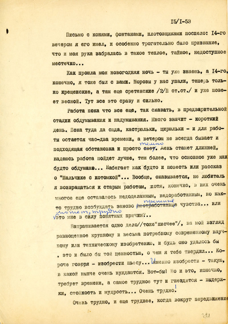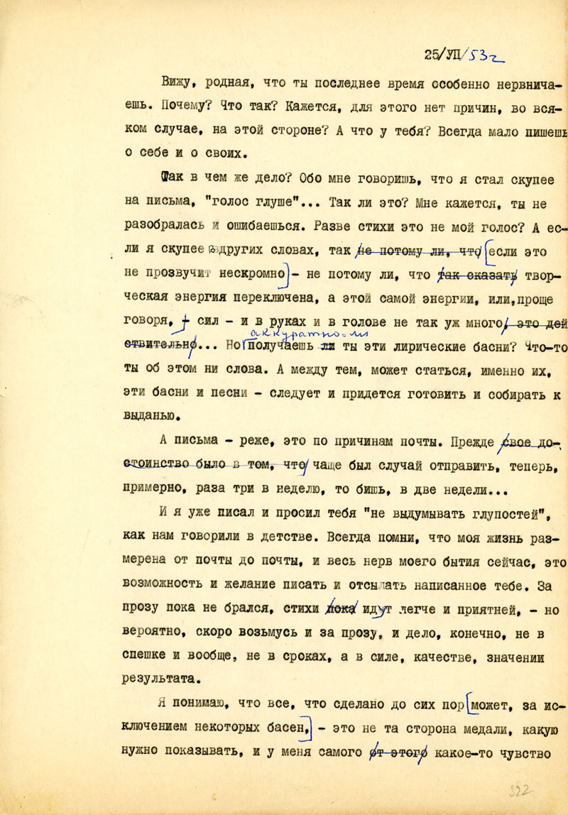 Так в чем же дело? Обо мне говоришь, что я стал скупее на письма, "голос глуше"... Так ли это? Мне кажется, ты не разобралась и ошибаешься. Разве стихи это не мой голос? А если я скупее & других словах, так (если это не прозвучит нескромно) - не потому ли, что творческая энергия переключена, а этой самой энергии, или, проще говоря, сил - и в руках и в голове не так уж много/
