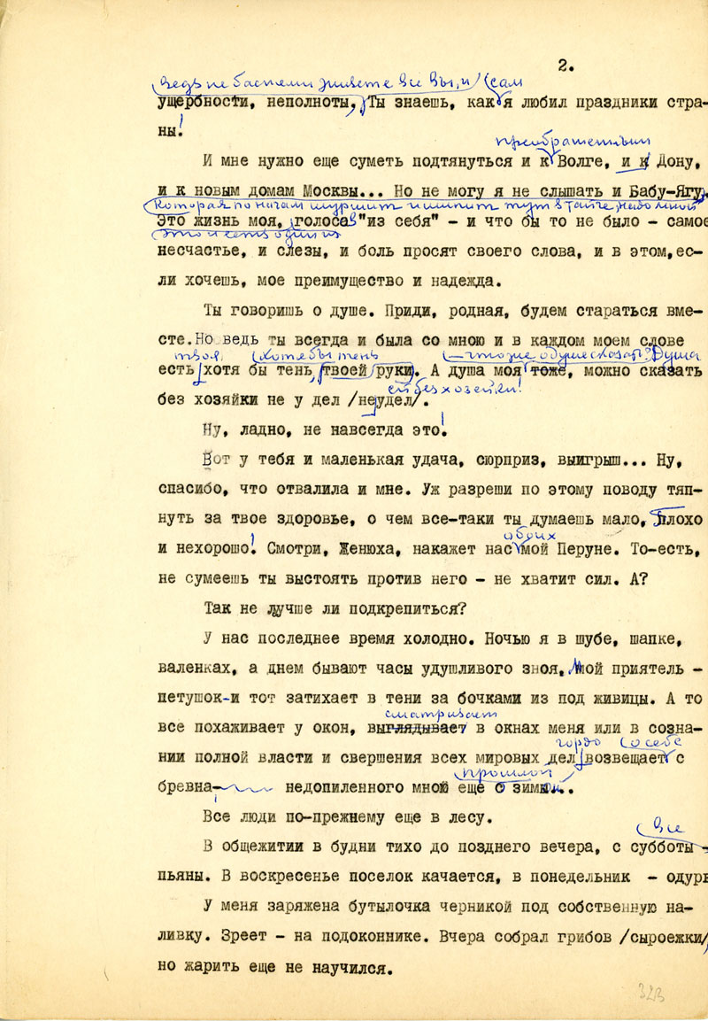И мне нужно еще суметь подтянуться и преображенным Волге, и Дону, новым домам Москвы... Но не могу я не слышать и Бабу-Ягу, которая по ночам шуршит и шипит тут в тайге надо мной. Это жизнь моя, это и есть один из голосов "из себя" - и что бы то не было - самое несчастье, и слезы, и боль просят своего слова, и в этом, ес¬ли хочешь, мое преимущество и надежда.