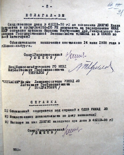 Дело по обвинению гр-на Дингес Ивана Петровича пересмотрено Военным трибуналом Ленинградского военного округа 21 октября 1957 года. Постановление от 11 октября 1938 года в отношении Дингес И.П. отменено и дело производством прекращено за отсутствием состава преступления.